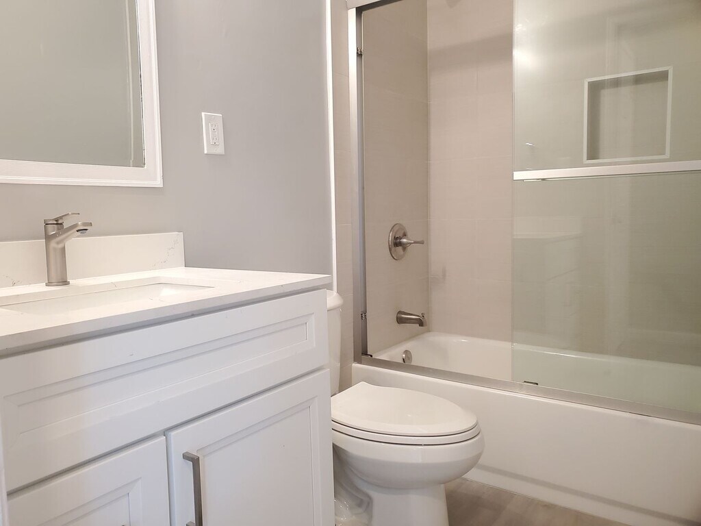 3762 Poinciana Drive, Santa Clara, CA 95051 (Poinciana/Lawrence) Spaciously remodeled lower level apartment with open floor plan. The home is located in a beautiful gated community with 1 bedroom and 1 bathroom. The apartment has been reinvigorated with a bold new open kitchen, fresh paint and new wood laminate flooring. The kitchen has new white cabinets with quartz counters, accented tile backsplash, and stainless steel appliances. The bathroom includes a new tile shower enclosure with a new tile floor and white vanity. The complex has been recently updated with synthetic grass, fresh exterior paint, and freshly sealed driveway. The property is located in a convenient location near Lawrence Expressway and a few minutes from El Camino Real with restaurants, banks, and shopping. 1 Car Carport with additional storage included. One year lease required. No pets except for required service animals. Cal DRE# 01998337