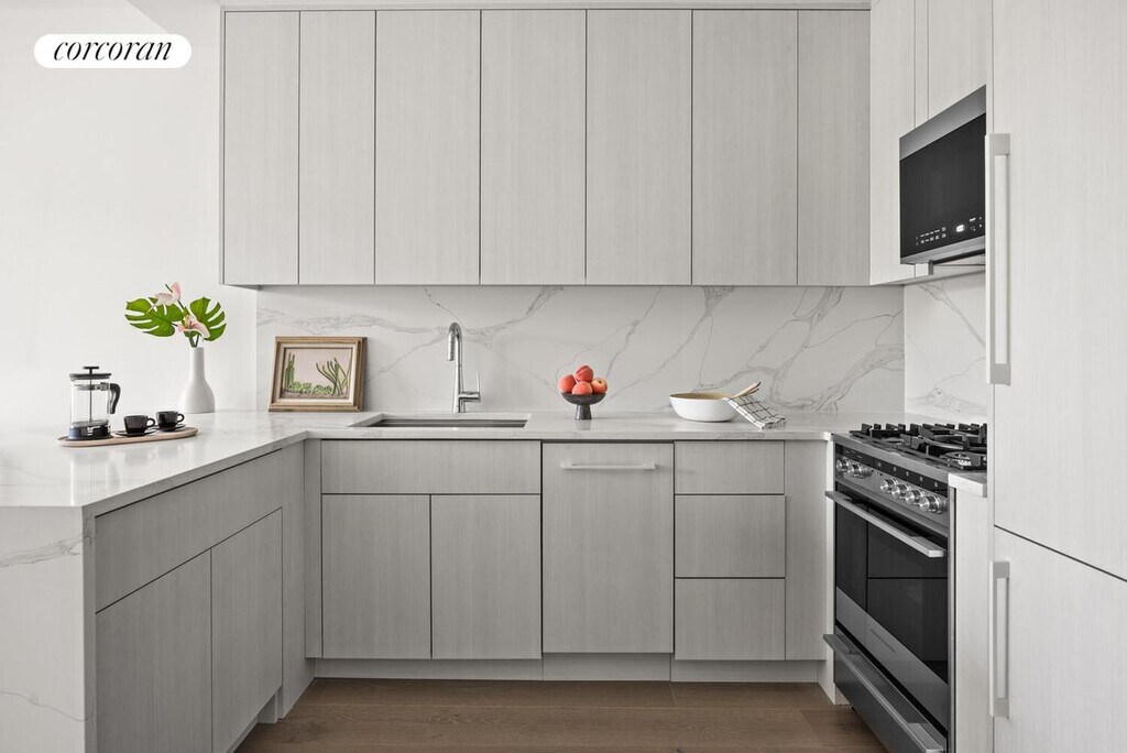 Unit 4A at Ocean 24 Condominiums offers a remarkably spacious and welcoming studio layout. Upon entering, you are greeted by an extended foyer that opens into a great room with a sleek, modern kitchen and a light-drenched dining and living area. The generously proportioned and airy interiors feature soaring ceilings, panoramic and soundproof Pella windows, and are complete with elegant wide-plank hardwood floors throughout. Beyond the living room is a balcony with sunset views and the tree-lined Ocean Parkway.The chef's kitchen includes Calacatta quartz countertops and backsplash integrated with under-cabinet illumination, a premier appliance suite by Fisher & Paykel, Frigidaire microwave oven, and Kraus stainless-steel sink. The luxurious bathroom has a deep-soaking Duravit bathtub, Grohe fixtures, and a Fresca vanity with generous under-sink storage maximizes functionality. This studio apartment is equipped with central heating and cooling systems, along with the convenience of an in-unit GE washer/dryer.This unit comes with access to a state-of-the-art fitness center and common rooftop space with unobstructed views of Manhattan skyline.Ideally located in the charming neighborhood of Kensington, Ocean 24 Condominiums grants you a coveted address mere moments to Prospect Park, bustling Cortelyou Road with access to top rated restaurants and cafes, farmer's markets, and a short distance to transportation.
