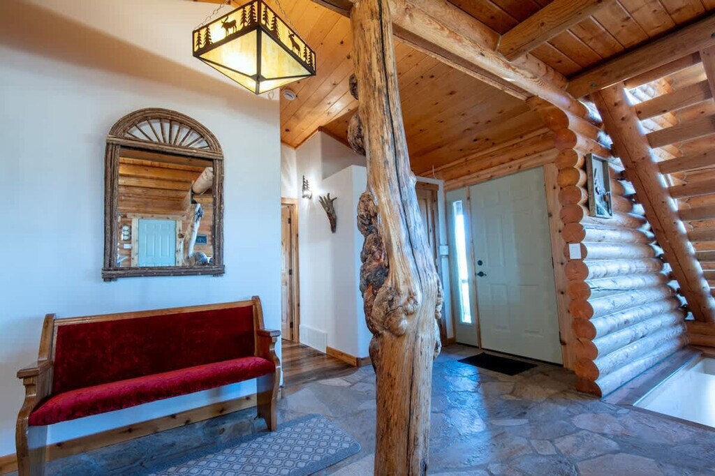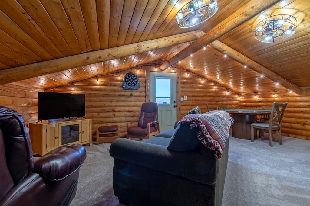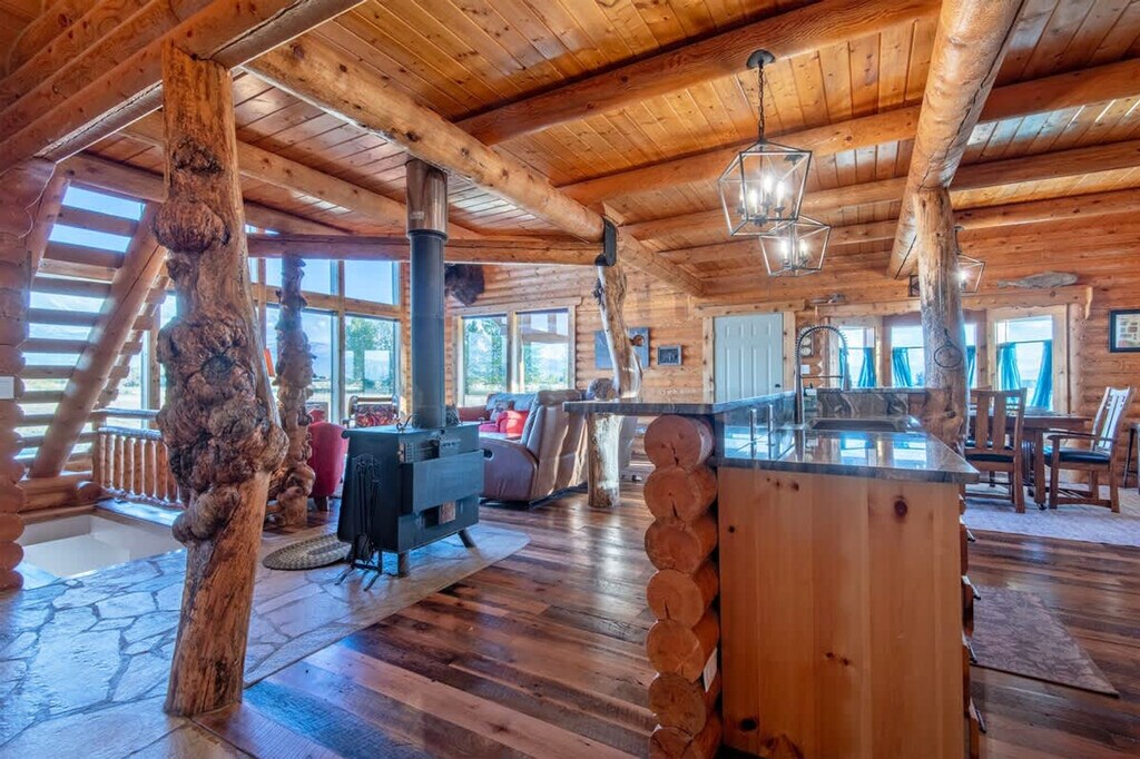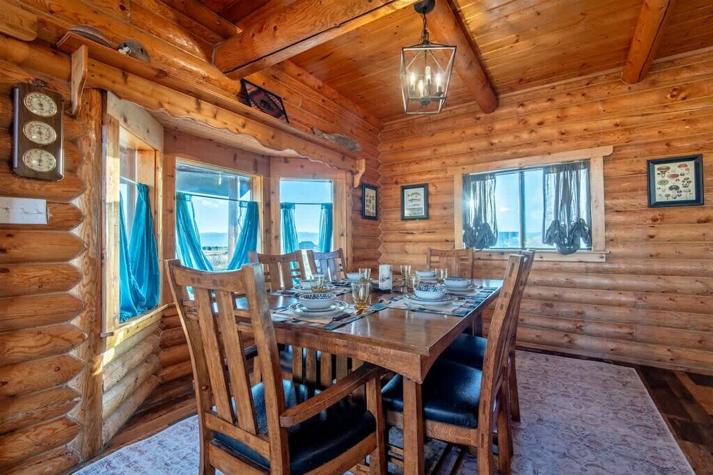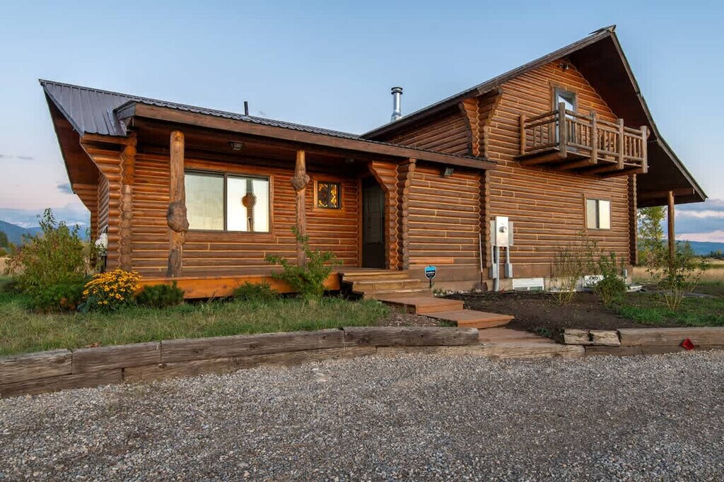 Escape to this newly renovated, all-log cabin in the heart of Teton Valley, where rustic charm meets modern convenience. Built by a local family, this cabin exudes the warmth and coziness of your grandma's home but offers the luxuries you expect for a perfect vacation. With 4 bedrooms, 3 bathrooms, and a loft, there's plenty of room for your whole group to unwind, relax, and enjoy the ultimate retreat. Imagine waking up each morning to breathtaking, unobstructed views of the majestic Teton Mountain Range. Whether you're sipping coffee on the expansive deck or warming up by the fire after a day of adventure, you'll be surrounded by some of the most incredible scenery in the West. This cabin offers unrivaled privacy, situated at the end of a cul-de-sac and surrounded by 5 acres, providing ample space to roam and unwind. Enjoy long walks or snowshoeing right on the property, all while being just minutes from Driggs and Victor, where you can grab a bite at a cozy local café or enjoy a gourmet meal. The cabin is great for families or groups, with several flexible sleeping arrangements, including a full-size hide-a-bed and a futon for additional sleeping space. Cozy up in the large living room, fire roaring, and watch the snow fall outside. Spread out with family and friends, enjoying the modern amenities of a well-equipped kitchen, luxurious bathrooms, and spacious bedrooms. The cabin has a NEMA 14-50 charger for Tesla in the shed, though guest access is currently limited. For now, we recommend using the nearby Tesla destination charger at Teton Distillery, just 3 miles away. Outside outlets are available for trickle charging on the property. World-class skiing at Grand Targhee Resort is just a short drive away, offering deep powder, uncrowded slopes, and unbeatable mountain views. Jackson Hole Mountain Resort, known for its expert terrain and breathtaking scenery, is also easily accessible for the more daring skier. A quick drive will take you to both Grand Teton and Yellowstone National Parks—two of America's most spectacular natural wonders. Explore these winter playgrounds with snowcoach tours, cross-country skiing, snowshoeing, and more. Just a 10-minute drive from the Teton River, you'll have access to world-class fly fishing, stunning river floats, and peaceful wildlife viewing opportunities. When you're ready for some downtime, head into Driggs or Victor to experience local dining and shopping, or stay in for a cozy night by the fire. There are two security cameras located on the property. One is on the balcony facing the driveway and parking area, and the other is on the back porch facing the backyard and well area. No cameras are located within the interior of the property. The number of people at the property should not exceed the maximum sleeping capacity. Quiet hours are from 9 pm to 8 am, and no events are allowed, including parties, large gatherings, or weddings. No smoking or vaping is allowed in the home or on the decks, and an additional charge will be applied if any butts are found on the property. Please turn all exterior lights off at night to preserve the dark skies. A maximum of three licensed vehicles is allowed in the driveway and garages. No riding snow machines, dirt bikes, or ATVs in the subdivision or at the rental property, and no fireworks on the premises. Keep all main entry doors locked when not occupied. Fines will apply for violations, including but not limited to: leaving garbage in the house or litter on grounds, failure to disclose or clean up after pets, smoking in the house or garage, failure to follow house rules and respect posted signs, failure to follow check-out procedure, mistreatment of hot tub, or violations of local laws. Minimum $500 fine for smoking, vaping, or marijuana use in the house or garage, violation of house rules, posted signs, laws, or failure to vacate at check-out time.