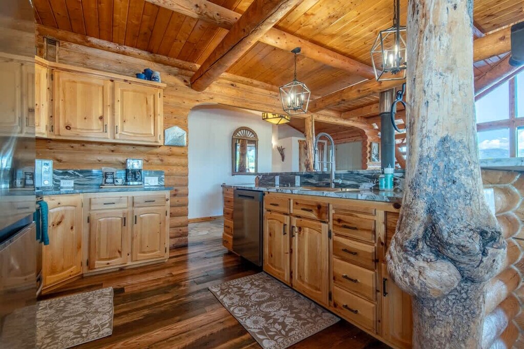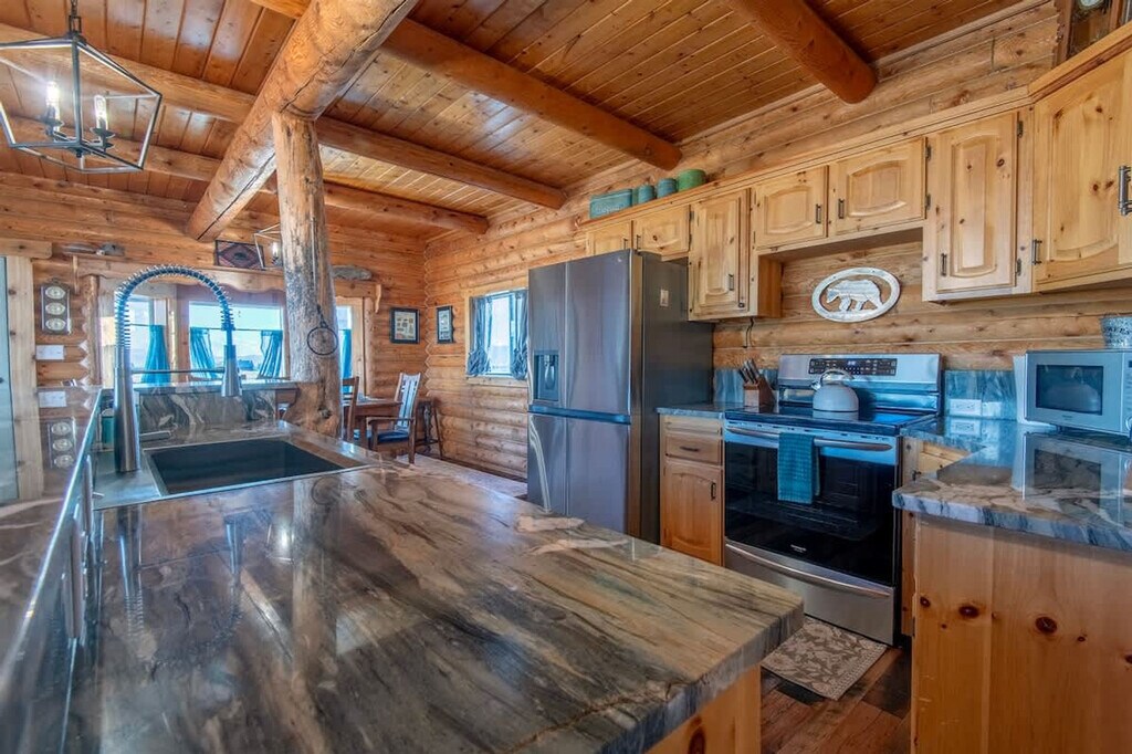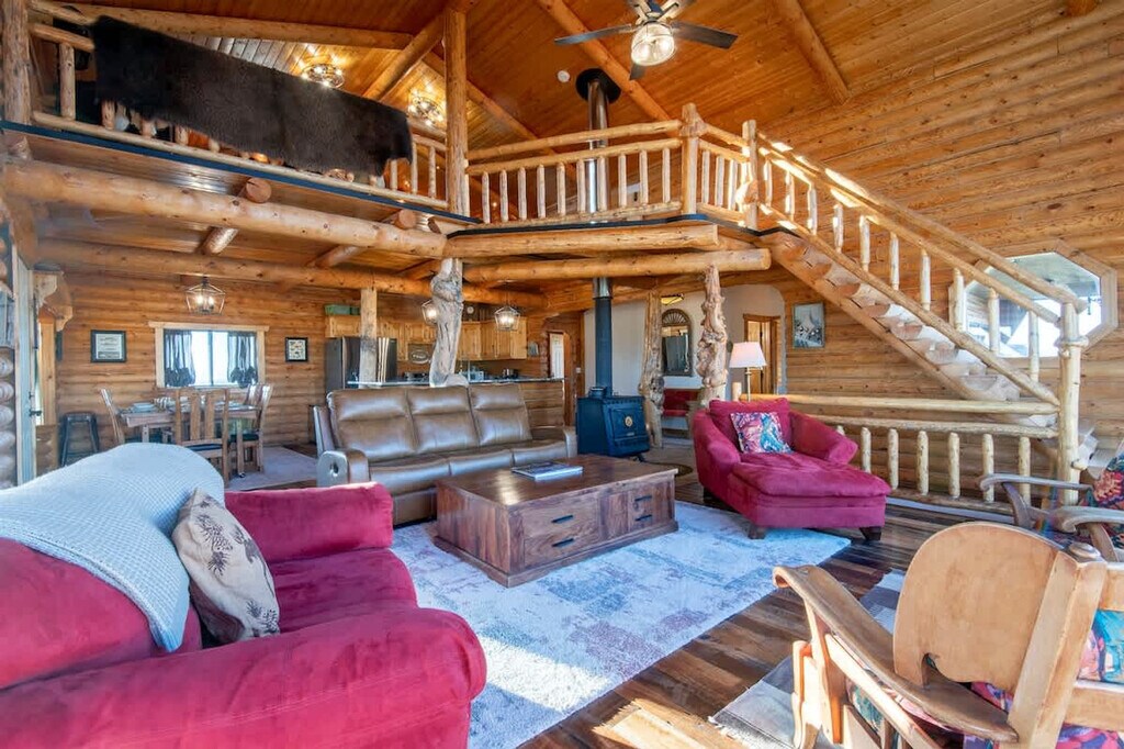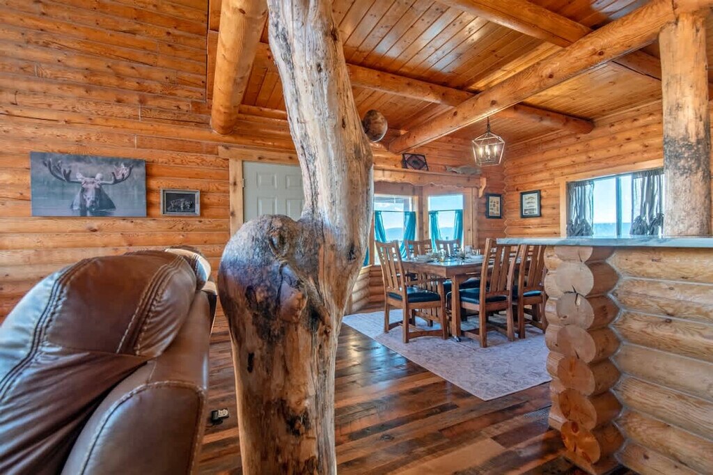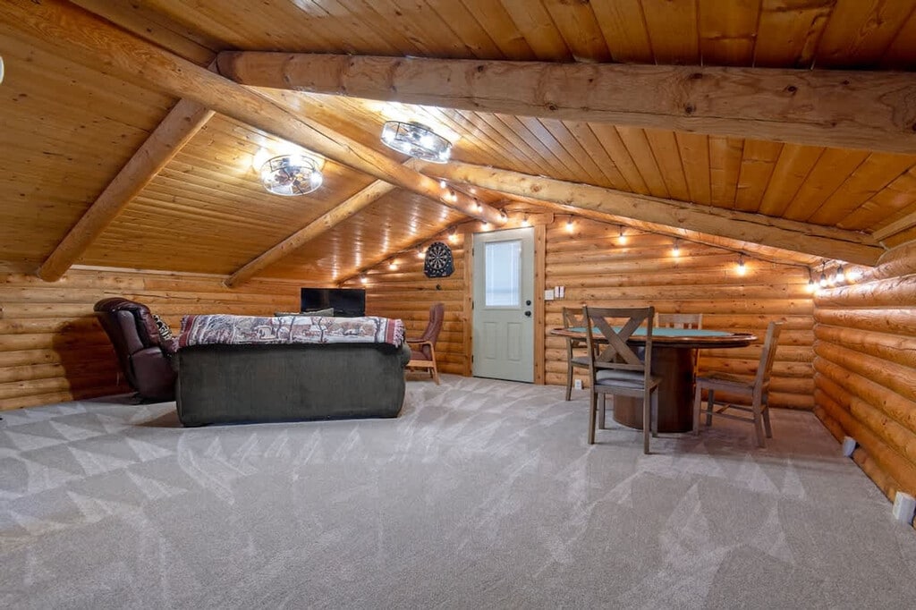Escape to this newly renovated, all-log cabin in the heart of Teton Valley, where rustic charm meets modern convenience. Built by a local family, this cabin exudes the warmth and coziness of your grandma's home but offers the luxuries you expect for a perfect vacation. With 4 bedrooms, 3 bathrooms, and a loft, there's plenty of room for your whole group to unwind, relax, and enjoy the ultimate retreat. Imagine waking up each morning to breathtaking, unobstructed views of the majestic Teton Mountain Range. Whether you're sipping coffee on the expansive deck or warming up by the fire after a day of adventure, you'll be surrounded by some of the most incredible scenery in the West. This cabin offers unrivaled privacy, situated at the end of a cul-de-sac and surrounded by 5 acres, providing ample space to roam and unwind. Enjoy long walks or snowshoeing right on the property, all while being just minutes from Driggs and Victor, where you can grab a bite at a cozy local café or enjoy a gourmet meal. The cabin is great for families or groups, with several flexible sleeping arrangements, including a full-size hide-a-bed and a futon for additional sleeping space. Cozy up in the large living room, fire roaring, and watch the snow fall outside. Spread out with family and friends, enjoying the modern amenities of a well-equipped kitchen, luxurious bathrooms, and spacious bedrooms. The cabin has a NEMA 14-50 charger for Tesla in the shed, though guest access is currently limited. For now, we recommend using the nearby Tesla destination charger at Teton Distillery, just 3 miles away. Outside outlets are available for trickle charging on the property. World-class skiing at Grand Targhee Resort is just a short drive away, offering deep powder, uncrowded slopes, and unbeatable mountain views. Jackson Hole Mountain Resort, known for its expert terrain and breathtaking scenery, is also easily accessible for the more daring skier. A quick drive will take you to both Grand Teton and Yellowstone National Parks—two of America's most spectacular natural wonders. Explore these winter playgrounds with snowcoach tours, cross-country skiing, snowshoeing, and more. Just a 10-minute drive from the Teton River, you'll have access to world-class fly fishing, stunning river floats, and peaceful wildlife viewing opportunities. When you're ready for some downtime, head into Driggs or Victor to experience local dining and shopping, or stay in for a cozy night by the fire. There are two security cameras located on the property. One is on the balcony facing the driveway and parking area, and the other is on the back porch facing the backyard and well area. No cameras are located within the interior of the property. The number of people at the property should not exceed the maximum sleeping capacity. Quiet hours are from 9 pm to 8 am, and no events are allowed, including parties, large gatherings, or weddings. No smoking or vaping is allowed in the home or on the decks, and an additional charge will be applied if any butts are found on the property. Please turn all exterior lights off at night to preserve the dark skies. A maximum of three licensed vehicles is allowed in the driveway and garages. No riding snow machines, dirt bikes, or ATVs in the subdivision or at the rental property, and no fireworks on the premises. Keep all main entry doors locked when not occupied. Fines will apply for violations, including but not limited to: leaving garbage in the house or litter on grounds, failure to disclose or clean up after pets, smoking in the house or garage, failure to follow house rules and respect posted signs, failure to follow check-out procedure, mistreatment of hot tub, or violations of local laws. Minimum $500 fine for smoking, vaping, or marijuana use in the house or garage, violation of house rules, posted signs, laws, or failure to vacate at check-out time.