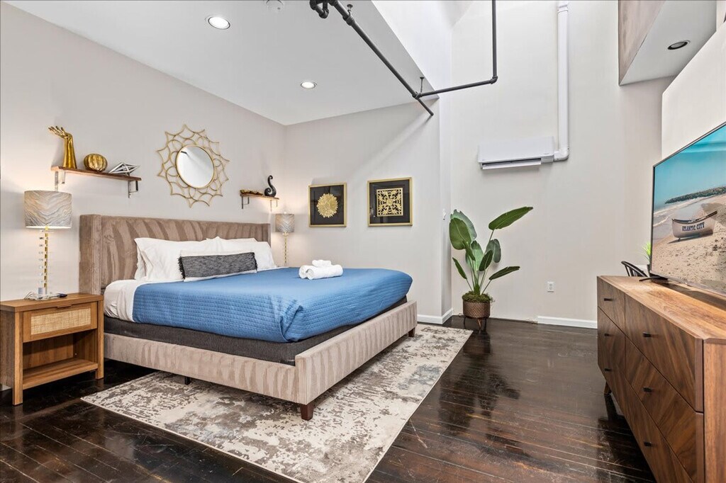 This modern loft offers a 1-bedroom and 2-bathroom layout with vibrant decor just steps from the beach and boardwalk. Enjoy a spacious living area filled with natural light, a jacuzzi tub, sauna, massage chair, and a luxurious dining room. Additional amenities include a fully equipped kitchen, HDTV with Roku, and fast Wi-Fi, perfect for a relaxing Atlantic City getaway. This apartment is the perfect retreat for those seeking a stylish, beachside escape with luxurious amenities and easy access to Atlantic City's best attractions. The beautifully appointed bedroom features a king-size bed and an ensuite bathroom with a jacuzzi tub. Fresh bedding and towels are provided, along with high-quality bath essentials. The fully equipped kitchen boasts stainless steel appliances, a dishwasher, and a coffee maker, complemented by an in-unit washer and dryer and a dedicated workspace. Convenient nearby street parking options are available, and a public EV charger is located right across the street. Located just steps away from the famous Atlantic City Boardwalk and the gorgeous Atlantic Ocean, this neighborhood offers breathtaking views and easy access to the sand and surf. Take a morning stroll along the beach, go for a swim, or simply soak up the sun on the pristine shoreline. When you're ready to explore the area, you'll find plenty of local restaurants, shops, and attractions just a short drive away. Whether you're looking for fresh seafood, fun activities for the whole family, or a vibrant nightlife scene, you'll find it all in the surrounding area. The apartment accommodates a maximum of 4 guests and enforces quiet hours from 10:00 PM to 8:00 AM. No pets are allowed, and the no-smoking policy is strictly enforced indoors, with any evidence of smoking resulting in an additional cleaning fee. No parties or events are permitted. Guests are required to upload a valid photo ID and verify with a selfie to the management company's secure portal before check-in. Security cameras are present on the exterior front entryway, rear entrance, and deck/patio/driveway area, recording audio and video footage 24/7. Smoking is allowed outside, away from doors and windows, and debris must be cleaned up. The apartment is perfect for remote work with high-speed Wi-Fi, making it ideal for video calls and productivity.