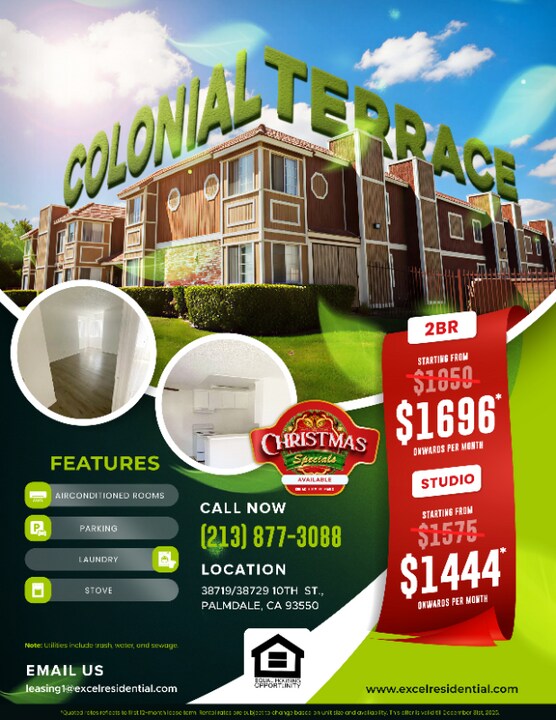 Property Id: 2289757 Welcome to Colonial Terrace! 38719 / 38729 10th Street, Palmdale, CA 93550 Beautiful rental apartments available now. Enjoy comfortable living in a calm, well-maintained community—ideal for individuals seeking convenience and value. SPECIAL OFFER Studio Apartment Available Base Rent: $1,575 Rent After Concession: $1,444* Section 8 Voucher Holders Welcome FEATURES AND UTILITIES INCLUDED Water Included Trash Included CONVENIENT LOCATION Quick access to SR-14 and SR-138 for easy commuting Close to schools, parks, and everyday essentials LEASING INFORMATION Leasing Hours: 1:00 PM - 4:00 PM Call Today: PLEASE NOTE The advertised rent reflects the concession; the base rent remains the same. The concession is applicable only on a 12-month lease. Prices and concessions are subject to change. Offer valid through December 31, 2025.