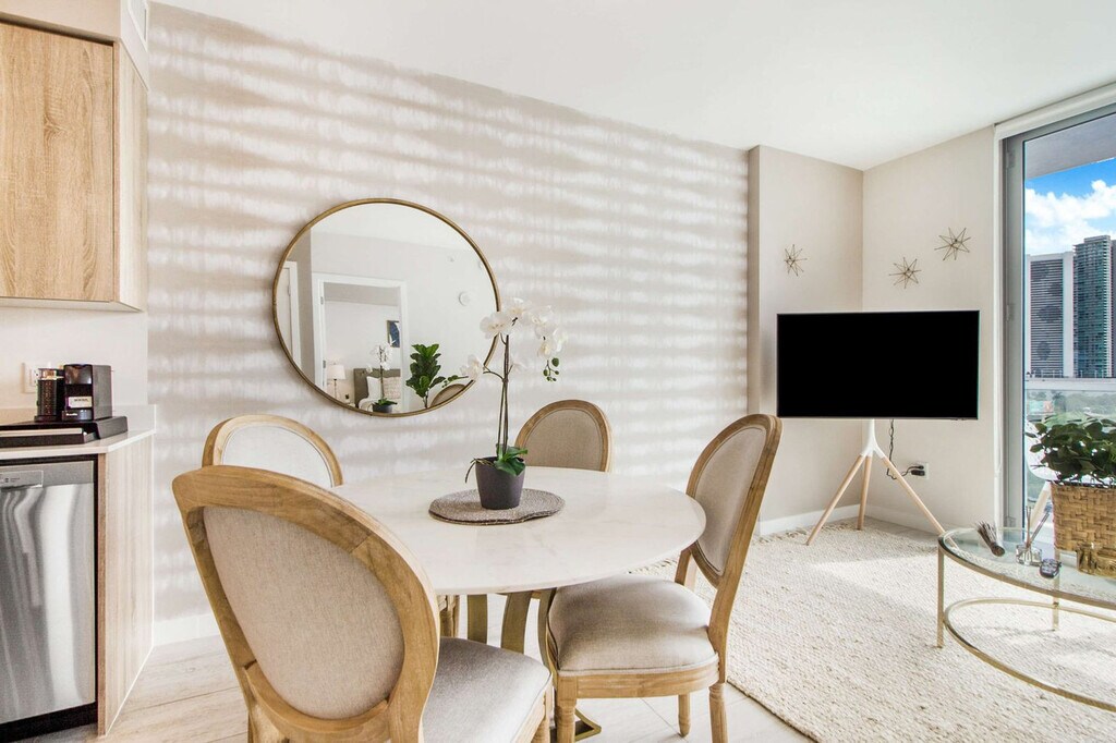 Experience luxury living in this exquisite condo located at Quadro in the Miami Design District. This beautifully furnished apartment features 1 bedroom, 1 full bathroom, a queen sofa bed in the living room, a den with a futon, and a balcony offering stunning city views. The building boasts amenities on the 6th floor, including a fitness center, a lounge with a co-working area and a game room, an outdoor dining area with BBQs, and a refreshing pool. Enjoy guest-exclusive neighborhood discounts and explore the vibrant surroundings with ease. The condo is conveniently located just a 10-minute drive from Miami’s international airport and a 15-minute drive to Miami Beach. Feel at home in this beautifully designed condo featuring a plush king-sized bed in the master bedroom, complete with direct access to a full bathroom with a shower, closet space, a TV, and blackout shades. The open-concept living and dining room includes a queen sofa bed, a flat-screen TV, a dining table, and an in-unit washer and dryer. The fully equipped kitchen is outfitted with a stainless steel dishwasher, microwave, electric stovetop, and a fridge with a water and ice maker. Additional kitchen essentials include an espresso coffee machine with welcome pods, a tea kettle, and a toaster. Parking is complimentary for guests. For families traveling with young children, a pack n play is available upon request. In-stay housekeeping services can be arranged for an additional fee, ensuring a comfortable and convenient stay. Nestled in the heart of the Miami Design District, this condo offers unparalleled walkability to a plethora of designer shops, supermarkets, restaurants, art galleries, and more. Enjoy the vibrant neighborhood and its cultural offerings, all within walking distance. With easy access to major roads, you can reach Miami’s international airport in just 10 minutes and the beautiful Miami Beach in 15 minutes. The building is fob-secured and offers on-site 24/7 security for your peace of mind. The maximum occupancy for this condo is four guests. Smoking and parties are not permitted on the premises. The condo features a lounge with a co-working area, providing a perfect space for remote work. Enjoy high-speed Wi-Fi and a comfortable environment to stay productive while away from the office. Registration Number: #CND2331726 [SI]