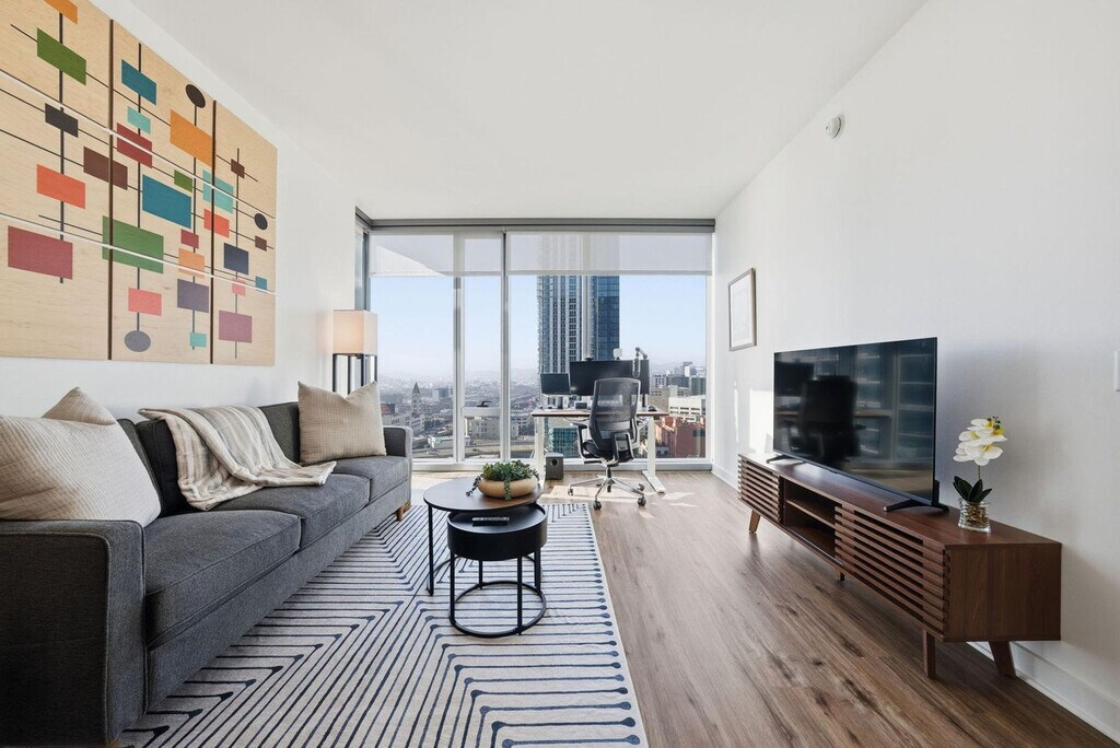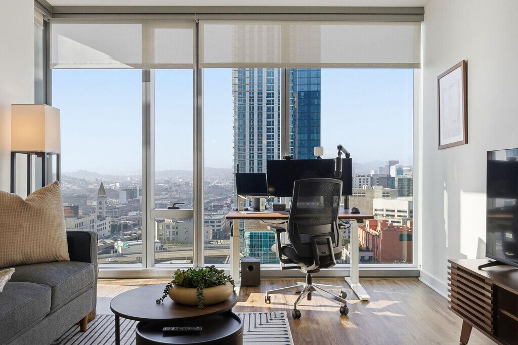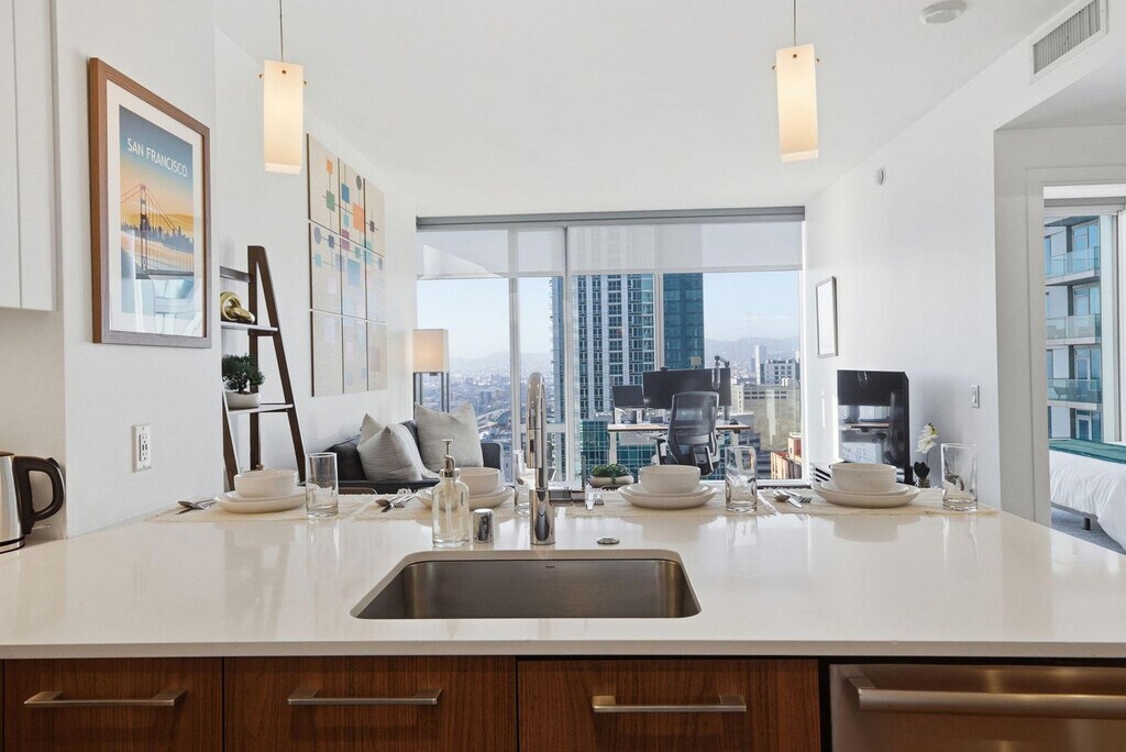 Feel at home in this high-rise, luxury apartment at 399 Fremont, your key to sophistication and convenience in San Francisco’s Rincon Hill neighborhood. This fully furnished, 1-bedroom apartment is custom-designed for a comfortable and productive environment. It includes a fully equipped kitchen, full bathroom, and smart TV. Amenities include central air conditioning and heating, stainless steel appliances, hardwood floors, floor-to-ceiling windows, in-unit laundry, walk-in closets, a fitness center with Technogym equipment, a spinning studio and yoga room, a business center and private conference rooms, a media lounge, social lounge, and TRX room, an outdoor patio with a grilling area, an outdoor, heated lap pool, and 24-hour concierge services. Secure garage parking is available by request only, based on availability, and guest parking is available at $35 per day. Storage is available starting at $175 per month. Towering over the Bay Bridge and steps from world-class restaurants, galleries, and nightlife, this 42-story skyscraper offers everything you need to work and play. Take in a game or concert at Oracle Park, stroll along the Embarcadero to watch the ships go by, or just enjoy the sunlight pouring in from the floor-to-ceiling windows. Internet speeds are not guaranteed and may fluctuate based on your computer model and the router location. Early check-in from 10 am to 3 pm will incur a fee of $75, and early check-in before 10 am will incur a fee of 1 full night's rent (based on selected dates). Late check-out from 11 am to 3 pm will incur a fee of $75, and late check-out after 3 pm will incur a fee of 1 full night's rent (based on selected dates). Late check-outs must be requested at least 48 hours in advance. Includes private high-speed internet, a standing desk (Uplift), an ergonomic work chair (Uplift), a 34-inch ultra-wide monitor (Samsung), a microphone (Blue Yeti), a webcam (Logitech), computer speakers (Bose), an LED streaming light, a green screen, a keyboard (Logitech), a mouse (Logitech), a laptop stand, and a TOTU 16-in-1 Triple Display USB-C 3.1 Docking Station. A laptop computer is not included. Partners reserve the right to conduct secure ID verification, background checks and request Proof of Income. Guests will have 24 hours to complete these steps. Booking confirmation is contingent upon the successful completion of these checks, as well as meeting the minimum eligibility requirements. [SI]