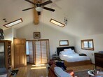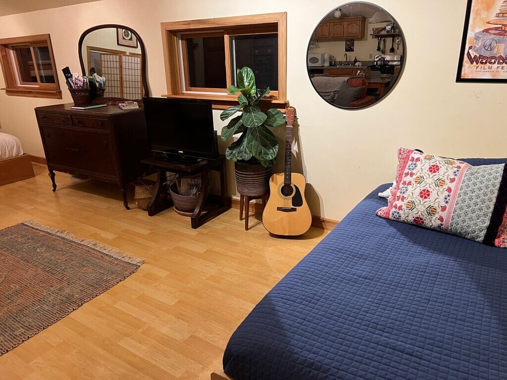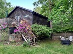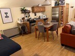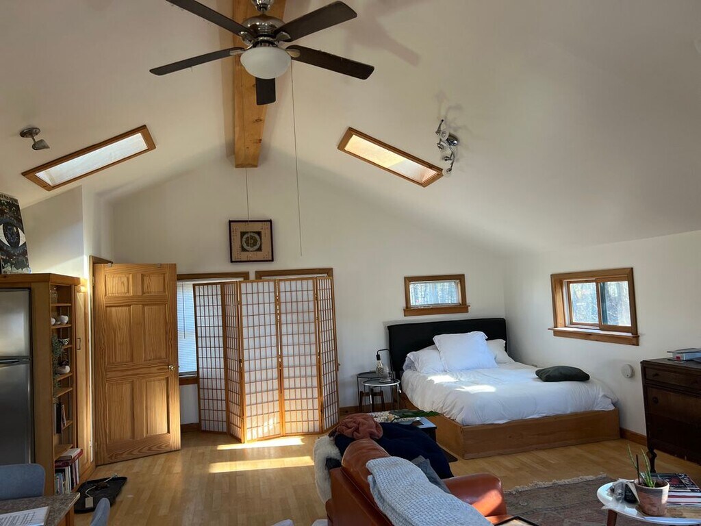 Private studio with mountain views and stunning sunsets in the heart of Woodstock! Studio is well insulated and energy efficient. Fully furnished with all the necessities. Serene mountain escape. Generator back up. Walk up the stairs to a magnificent open studio space with breathtaking mountain views. Skylights and ample windows make for artistic lighting throughout, full sized fridge and dishwasher. Exposed beams, ceiling fans, and private deck for enjoying sunrises and sunsets. Outdoor yard and dining area. Studio looks out onto Mead's Mountain. An inspiring retreat, let this cottage be your muse! Relish living in the forest and watching the seasons change in your private retreat perched above it all. Watch the mountain change thru your windows from the vibrant summer, colorful fall, majestic winter, to verdant spring! Centrally located, minutes to Woodstock town center, 15 minutes to Kingston. Scenic walks and hiking right outside the door, wildlife surrounds you. Large Studio, above dwelling garage, steps required. Landlord pays electric and for plowing.