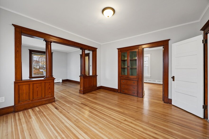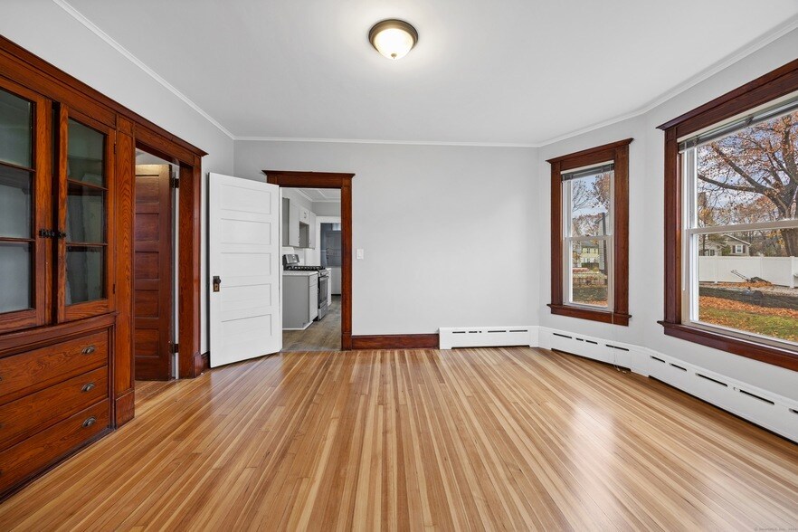 This expansive and charming first-floor apartment seamlessly blends classic character with modern updates. Featuring beautifully refinished natural woodwork and hardwood flooring throughout the living and dining rooms, this home exudes timeless elegance. The layout includes 5 well-appointed rooms: 2 spacious bedrooms, a formal dining room, a welcoming living room, and a fully updated kitchen. The entire unit has been thoughtfully refreshed with tasteful updates throughout. Convenience is key with an in-unit washer and dryer. Outside, you'll enjoy a deep backyard and newly paved, ample off-street parking. Efficient gas utilities complete this comfortable and stylish living space.