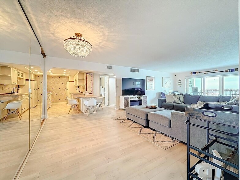 This stunning twelfth floor condo in the heart of St. Pete Beach delivers panoramic views of the Gulf of Mexico, the Bay, and Downtown St. Petersburg, offering a bright and beautifully furnished one bedroom residence that is fully prepared for immediate move in upon association approval. The displayed rent applies to lease terms of six months or longer, and shorter term stays under six months are available at a premium for those seeking a seasonal retreat. Inside, the spacious open living area extends into a flexible sitting and workspace, and the updated kitchen features porcelain tile flooring, light cabinetry with under cabinet lighting, generous counter space, and a pantry with roll out shelving. The bedroom is comfortable and inviting, while the spa inspired bathroom showcases porcelain tile walls, a walk in shower, and solid surface countertops. Additional features include hurricane impact windows and sliders with shutters, a newer HVAC system installed in 2021, excellent interior storage, and convenient laundry facilities on every floor. Three Palms Point is a guard gated waterfront community offering resort style amenities such as a heated waterfront pool, clubhouse, fitness center, sauna, billiards room, shuffleboard courts, and a private fishing pier, paddleboard and bicycle storage available. All of this is located just three blocks from the sandy beaches of St. Pete Beach and within minutes of the vibrant dining, museums, and cultural attractions of Downtown St. Petersburg, with Tampa and major airports only forty minutes away.