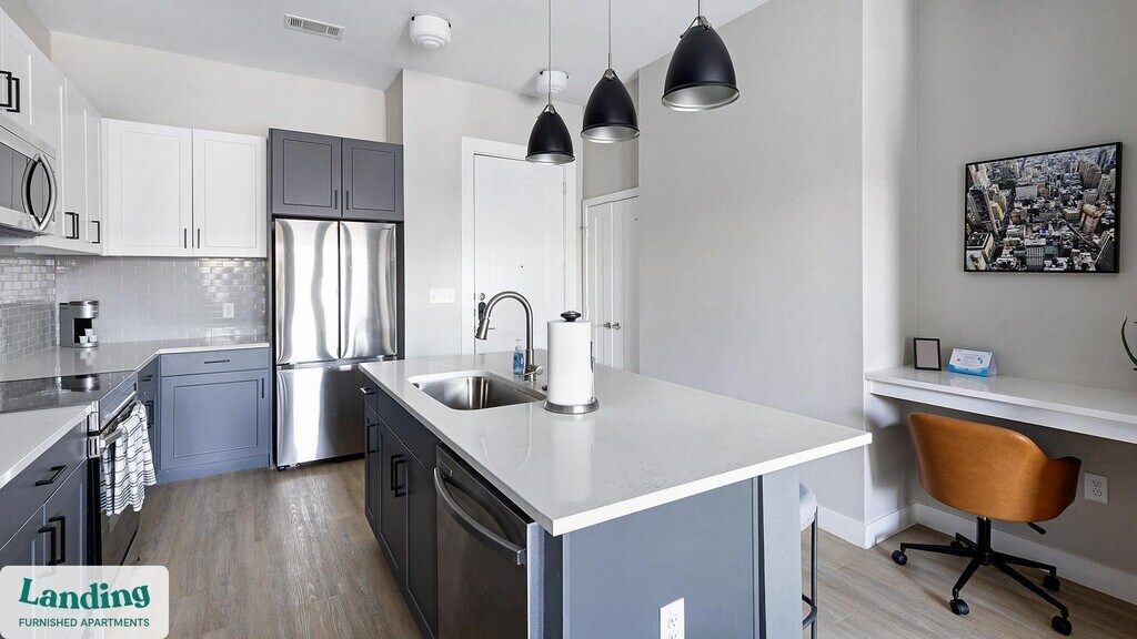 Landing offers flexible lease terms from weeks to months. Please always visit our website or contact us for the latest pricing & availability. Stay longer, save more: 6-Month Minimum base rent: starts at $2160/mo 12-Month Minimum base rent: starts at $1788/mo Landing offers flexible leases across a network of over 35,000 fully-furnished apartments throughout 375+ cities so you can rent on your terms, practically anywhere, and avoid the hassle of paying deposits or application fees. Visit to learn about all the benefits of a Landing membership, see our competitive up-to-date pricing, explore available apartments, take virtual tours, and make reservations online without jumping through traditional rental hoops. Landing's apartments at Skyview at Crawford are designed for comfortable, easy living, with the ability to stay as long as you like. Experience living with Landing Every apartment is outfitted with all the modern essentials including: custom-designed furnishings, a fully-equipped kitchen with deluxe stainless steel appliances, a gourmet coffee maker, premium linens, Smart TVs, and incredibly fast, reliable internet for working from home. When you live with Landing, you'll enjoy a hassle-free experience with the added benefit of 24/7 access to our dedicated member experience team. Some of the nitty-gritty: a background check and proof of income are required; we're completely smoke-free; bundled utility packages and pricing vary based on length of stay; pet-friendly options available; listed price reflects a 12-month minimum stay.