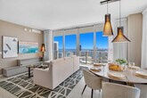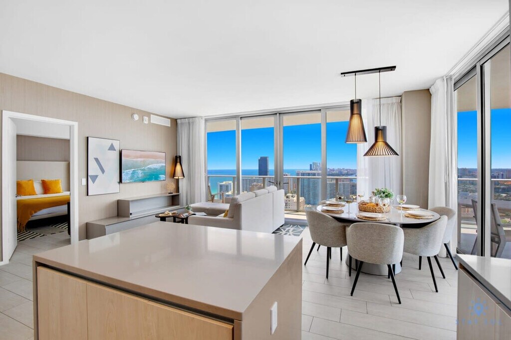 Feel at home in this brand new luxury condo in front of Hollywood Beach, a few minutes' drive to Aventura Mall and Sunny Isles Beach. Located on a high floor, this 3-bedroom unit features bay and ocean views. This well-appointed apartment mixes natural wood and stone with organic textures and state-of-the-art technology. Highlights include a full kitchen and a large corner balcony to enjoy a panoramic view of the bay and the ocean. The fully equipped kitchen offers a stainless steel refrigerator/freezer, glass stove, integrated oven, silent dishwasher, integrated microwave, stove, dishes, and coffee maker. Also included are a hairdryer, an electronic safe, an iron/ironing board, an in-suite washer/dryer, and TVs in each room. Amenities include two infinity-edge ocean and bay view pools, a sundeck, private cabanas, a fitness center, and a hot tub. Valet parking is available for a fee of $40 nightly for 1–6 nights, $15 nightly ($105 weekly) for 7–29 nights, and $9.33 nightly ($280 monthly) for 30+ nights. A pack’n play crib is available upon request free of charge. Just beyond the resort, you'll find the Hollywood Beach boardwalk and miles of Blue Wave-designated beaches. Surrounded by lots of restaurants and the world-famous Gulfstream Park, where you can dine, enjoy horse races, or try your luck at the casino five minutes away. To the west, you can visit the famous colossal Hard Rock Guitar Hotel & Casino, and it is the perfect location to be on the beach if you are attending an event at Hard Rock Stadium. To the south, you can continue to the renowned Aventura Mall, or if you feel like going on an adventurous nightlife, you can head to South Beach to party all night. To the north, you can enjoy more shopping and restaurants in the city of Fort Lauderdale. A 24-hour Walmart is right next door for groceries, and a Publix Supermarket is a two-minute drive away. Swimming is at your own risk, as there is no lifeguard on duty. Children must be supervised by a responsible adult at all times. For your safety, no diving and no running are permitted. Please keep all doors closed and the air conditioning on at all times to help prevent condensation and property damage. [SI]