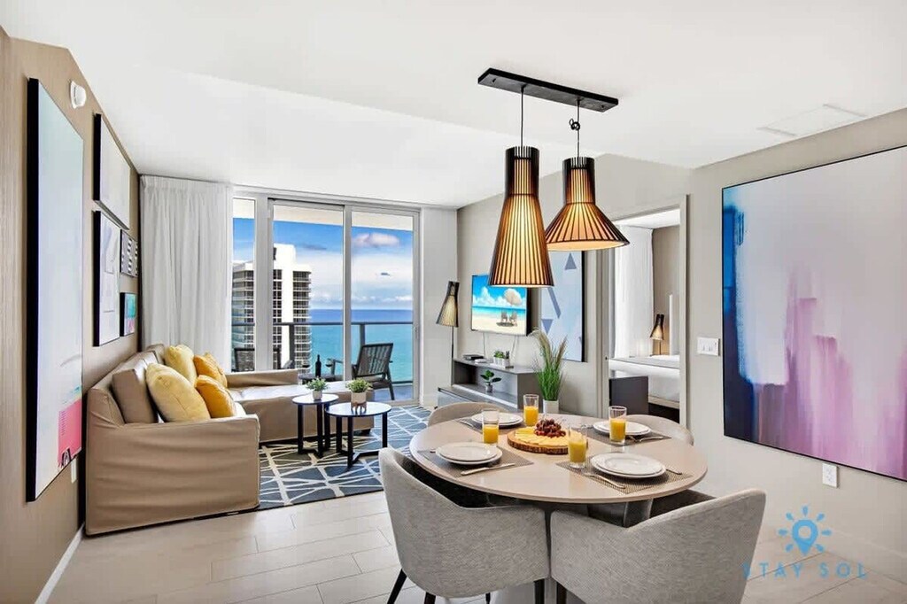 Feel at home in this brand new luxury condo in front of Hollywood Beach. This two-bedroom unit features a full kitchen, two full bathrooms, an oceanfront balcony, and an in-unit washer and dryer. This well-appointed apartment mixes natural wood and stone with organic textures and state-of-the-art technology. Highlights include a fully equipped kitchen with a stainless steel refrigerator/freezer, glass stove, integrated oven, silent dishwasher, integrated microwave, stove, dishes, and coffee maker. Additional amenities include a hairdryer, an electronic safe, an iron/ironing board, and TVs in each room. Amenities include two infinity-edge ocean and bay view pools, a sundeck, private cabanas, a fitness center, and a hot tub. Valet parking is available for a fee of $42 nightly for 1–6 nights, $15 nightly ($105 weekly) for 7–29 nights, and $9.33 nightly ($280 monthly) for 30+ nights. A pack’n play crib is available free upon request. Just beyond the resort, you'll find the Hollywood Beach boardwalk and miles of Blue Wave-designated beaches. Surrounded by lots of restaurants and the world-famous Gulfstream Park, where you can dine, enjoy horse races, or try your luck at the casino five minutes away. To the west, you can visit the famous colossal Hard Rock Guitar Hotel & Casino, and it is the perfect location to be on the beach if you are attending an event at Hard Rock Stadium. To the south, you can continue to the renowned Aventura Mall, or if you feel like going on an adventurous nightlife, you can head to South Beach to party all night. To the north, you can enjoy more shopping and restaurants in the city of Fort Lauderdale. The apartment is minutes from Fort Lauderdale airport. For groceries, you will find a 24-hour Walmart right next door and a Publix Supermarket two minutes' drive away. Swimming is at your own risk, as there is no lifeguard on duty. Children must be supervised by a responsible adult at all times. For your safety, no diving and no running. The property management is not liable for any accidents, injuries, or losses that may occur while using the pool or surrounding areas. Please keep all doors closed and the air conditioning on at all times to help prevent condensation and property damage. [SI]