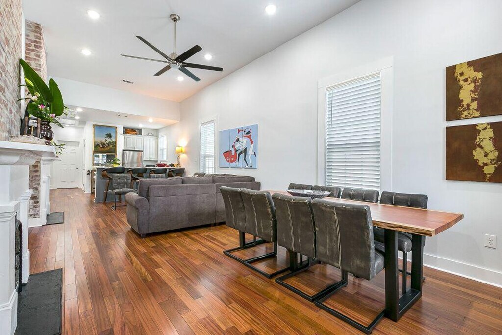 This recently remodeled house on the famously hard-to-spell Tchoupitoulas Street is situated in one of the most up-and-coming neighborhoods in New Orleans. This one-level house features a spacious layout with historic architectural details, exotic hardwood floors, five private bedrooms, and three gorgeous bathrooms, each furnished for your comfort. This is the ideal setting for large family gatherings, special celebrations, and weekend getaways, combining modern amenities with historic architectural details and local New Orleans charm. The house boasts a beautiful open-plan living and dining room area, a brand new kitchen equipped with all the tools, and a backyard patio with tables, chairs, and overhead string lighting. The property offers an extra-long gated driveway with space for three cars and free street parking. For an additional fee, daily housekeeping services are available upon request. Famous late-night bars such as Tipitina’s, F&M’s, and Le Bon Ton are all within walking distance, as are countless restaurants and shops. Located in the Uptown neighborhood of NOLA, it's just a 10-minute ride to the French Quarter and Bourbon Street and close to Audubon Park, Tulane University, Mississippi River Heritage Park, and The National WWII Museum. Enjoy the vibrant atmosphere of Magazine Street with its bars, restaurants, and music venues. The house is equipped with air conditioning, internet, and a smart TV. Video surveillance may be used in public areas. Gatherings of more than 10 people, including both overnight guests and visitors, are not allowed and may be subject to eviction. Extra guests and visitors are not permitted without management consent, and the number of overnight guests cannot exceed the maximum occupancy. Must climb stairs. No smoking is allowed in the house or on the balcony, with a $250 fine plus cleaning costs for violations. Quiet hours are observed from 9pm to 8am, with a $200 fine for violations. House parties and illegal substances are strictly prohibited, with a $500 fine for violations. Pets are not allowed, with a $500 fine plus cleaning expenses for violations. Guests with service animals are encouraged to contact management before their stay. A traveler must be at least 21 years of age to make a reservation, and a state identification card or driver's license copy will be requested upon booking. Local resident restrictions apply, and guests residing within a 100-mile radius are required to contact management before booking. For same-day late check-ins, host approval is required before booking. [SI]