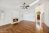 Nestled within the secure, guard-gated enclave of the Villages of San Jose, this charming home offers comfortable, maintenance-free living in a highly sought-after community. The neighborhood boasts lush, well-kept landscapes, a serene lake, a swimming pool, & pickleball/tennis courts, creating a perfect backdrop for leisurely strolls & an active lifestyle.The residence features a versatile, smart floor plan that can function as a 2 bedroom, 2 bath home w? an office, or easily convert to a full 3bedroom layout to suit your needs.Step inside to discover elegant wood flooring & classic plantation shutters throughout. A spacious family room, complete w/ cozy fireplace, provides a welcoming atmosphere & offers views of the large, private backyard & covered patio ideal for relaxing or entertaining. The home is rounded out by a formal dining room, a convenient eat-in kitchen,& practical 2 car attached garage, all situated in a peaceful cull-de sac.