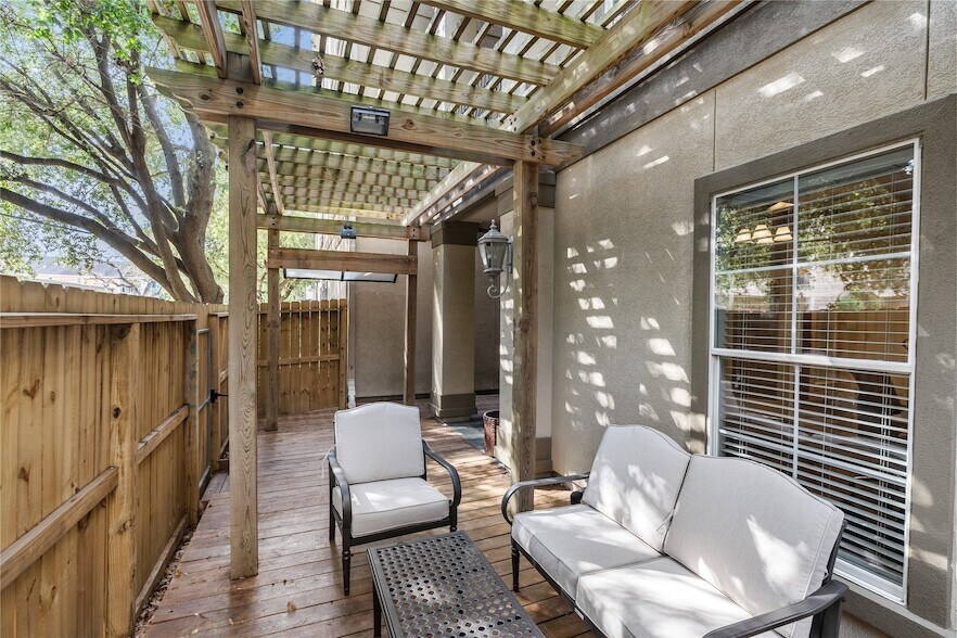 Ideally located in Rice Military with easy access to Downtown, the Galleria, and both Buffalo Bayou and White Oak Bayou trails, this updated townhouse blends smart living with stylish comfort. Enjoy a recently rebuilt private deck, fresh fencing, and a low-maintenance patio perfect for entertaining. Inside, the first-floor bedroom with en suite bath opens to this outdoor space, ideal for guests or a home office. The second floor features high ceilings, crown molding, oak floors, and a spacious layout connecting the refreshed kitchen to dining and living areas. A gas fireplace, smart lighting, and French doors lead to a charming balcony with views of a mature oak tree. Upstairs, the primary suite offers dual walk-in closets and a renovated bath, plus a third en suite bedroom. Recent updates include: roof (2023), water heaters (2024), select window replacements (2025), smart thermostats, garage opener, and lighting, all Apple/Google/Alexa compatible. Washer/dryer and fridge included.