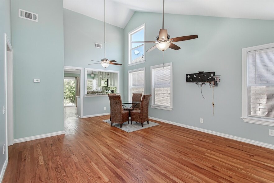 Location!!! This updated single family home is located in a quiet cul-de-sac just off 635 and Midway. The ceilings are raised in every room and expansive windows create an incredibly bright open concept. The kitchen includes granite counters, tile backsplash, stainless range, microwave, and dishwasher. The primary bedroom and bathroom are large and open up to the private fenced yard area. This yard is perfect for those who love to be outside but don t want to spend every weekend mowing! No carpet in sight, instead there are gorgeous real hardwood floors throughout with tile bathrooms. You must see this one in person, there's even a community pool!