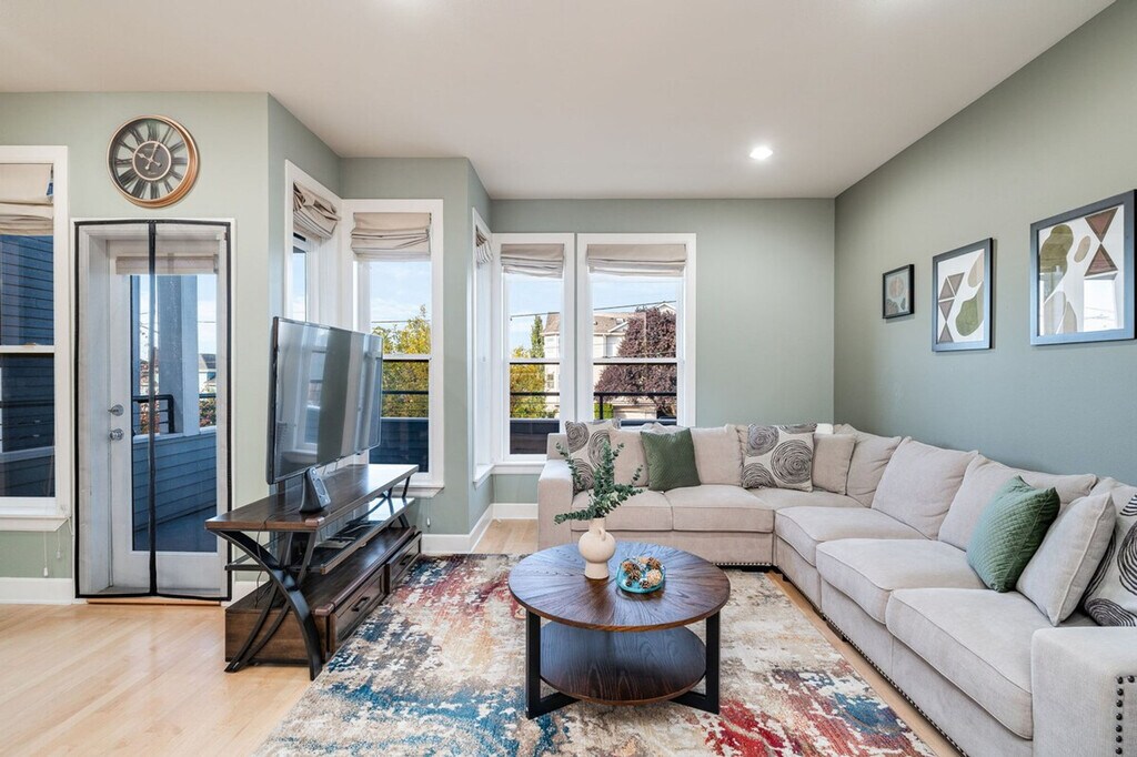 Discover the charm of Fremont with this spacious 3-bedroom, 3.5-bathroom townhome, offering 2200 sqft of living space across three stories. Situated just two blocks from the vibrant Fremont Ave, this home provides a serene retreat on a quiet street, perfect for exploring both Fremont and Seattle. Enjoy the convenience of a no-step entrance and access to a 2-car garage. Feel at home in this tastefully decorated townhome featuring a fully stocked kitchen with modern appliances, cookware, and a Keurig coffee maker. The living room is equipped with a smart TV, and the home boasts multiple balconies, a fully fenced backyard, and large windows that fill the space with natural light. Each bedroom has its own dedicated bathroom, making it ideal for group travels. This townhome offers ample parking with a 2-car garage and driveway space. Portable AC units are available to keep you cool during the summer months. Welcome to the eclectic Fremont neighborhood of Seattle, where indie shops and hip bars abound. Explore quirky outdoor sculptures like the Fremont Troll and the Fremont Rocket, or enjoy the Fremont Sunday Market with its art, antiques, and food trucks. The area is home to tech workers and arty residents who frequent the local eateries. The Burke-Gilman Trail offers a scenic route for cyclists and walkers along the canal. This is not a pet-friendly home, and there is a $500 fine for unauthorized pets. The property strictly enforces no parties or events, quiet hours between 10pm and 8am, and no smoking or vaping anywhere on the premises, including outdoor areas, with a $500 fine per violation. Guests should be comfortable with stairs as the townhome spans multiple stories. Check-in is facilitated via a door code, and a Ring Camera is installed by the front door. Ideal for remote work, this townhome includes two dedicated offices with fast internet, making it perfect for those who need a reliable workspace. Registration Number: STR-OPLI-22-001584 [SI]