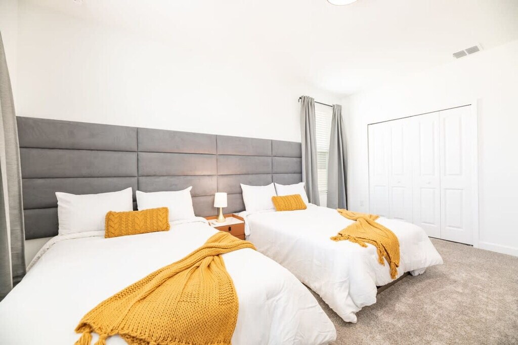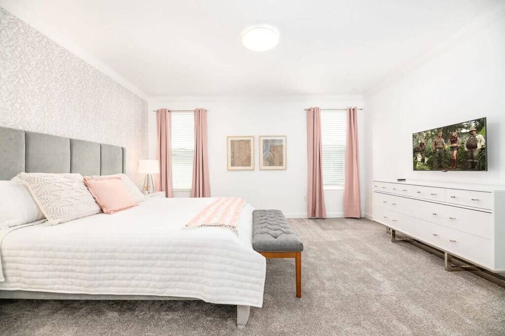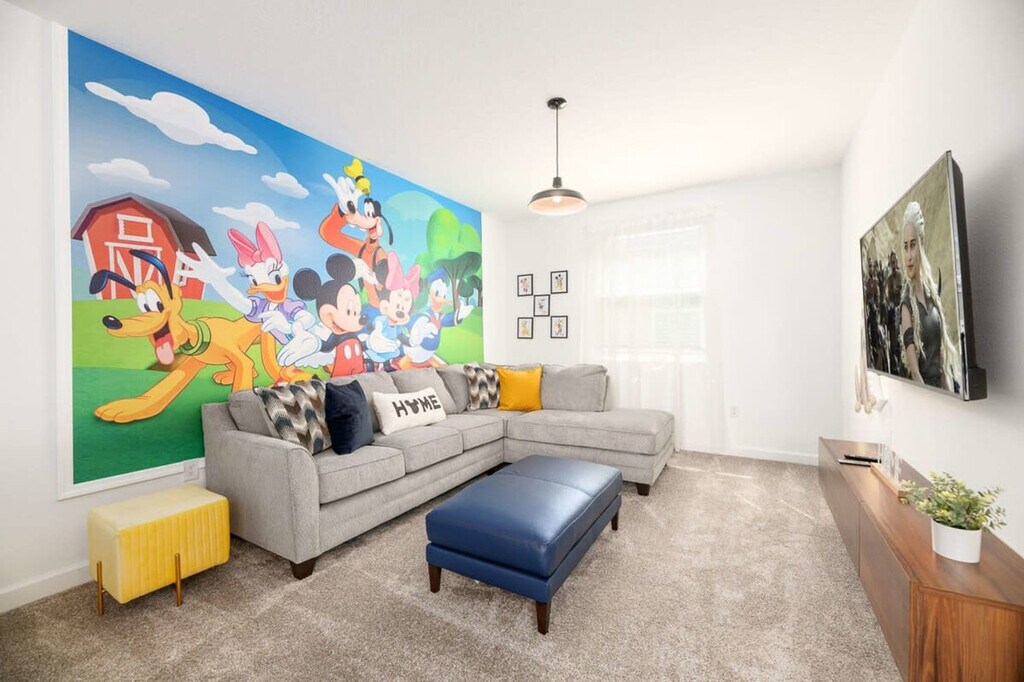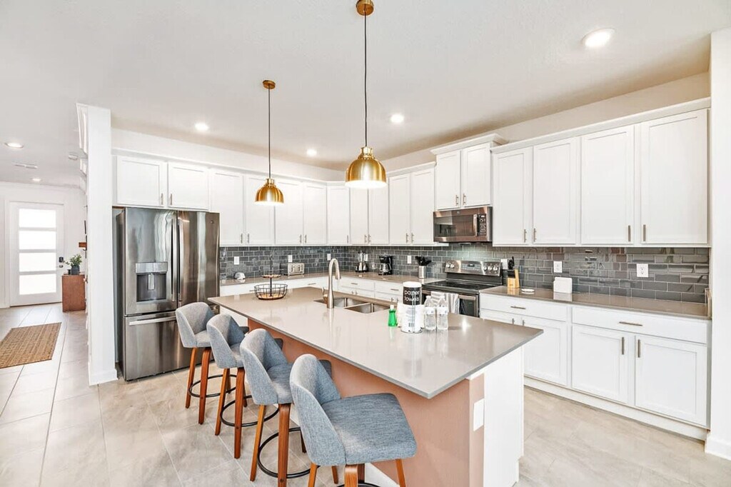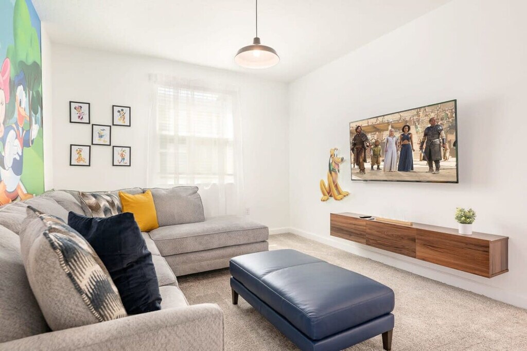 Experience the perfect vacation in this luxurious 6-bedroom, 5-bathroom home located in Storey Lake Resort, just 10 minutes away from Disney parks. Feel at home with the comforts of a private pool and expansive living space, along with the convenience of nearby restaurants and stores. Gather friends and family in this beautiful home-away-from-home for an unforgettable getaway. This 6-bedroom, 5-bathroom holiday home boasts modern décor and luxurious amenities, including a private and heatable pool, a patio with a barbecue grill, a spacious and modern living and dining room, and a fully equipped kitchen. The first floor offers a king bedroom and a bathroom. Upstairs, five additional bedrooms await your family with their own private décor and bathrooms. The master king suite, a Star Wars-themed bedroom with a full bed and its own private bathroom, a suite with two full beds and its own bathroom, a Mickey-themed bedroom with a full and a twin bed, and a Stitch-themed bedroom with a full bed share a full bathroom. Relax in the Disney-themed family room equipped with games and a laundry room with a washer and dryer. Enjoy free WiFi and free parking in a covered garage space, as well as a welcome package of basic bathroom and kitchen supplies. Heating the pool is a paid service and there is a fee charged to use the barbecue grill. Storey Lake Resort is perfectly located just 10 minutes from all major attractions and theme parks in Orlando, including Walt Disney World, Universal Resort, and Sea World. Enjoy fantastic resort amenities for the whole family, such as a tiki bar, a resort-style pool with slides and a lazy river, a sports court, mini-golf, kayaking, and a fitness center. There are two clubs inside the property, one featuring a themed pirate pool that kids will love, just walking distance from the house. Situated just off Osceola Parkway, the resort offers easy access to restaurants, shopping, and supermarkets, all within a 5-minute drive. Quiet hours are between 22:00 and 8:00. Replenishment of bathroom and kitchen amenities is the guest's responsibility. [SI]