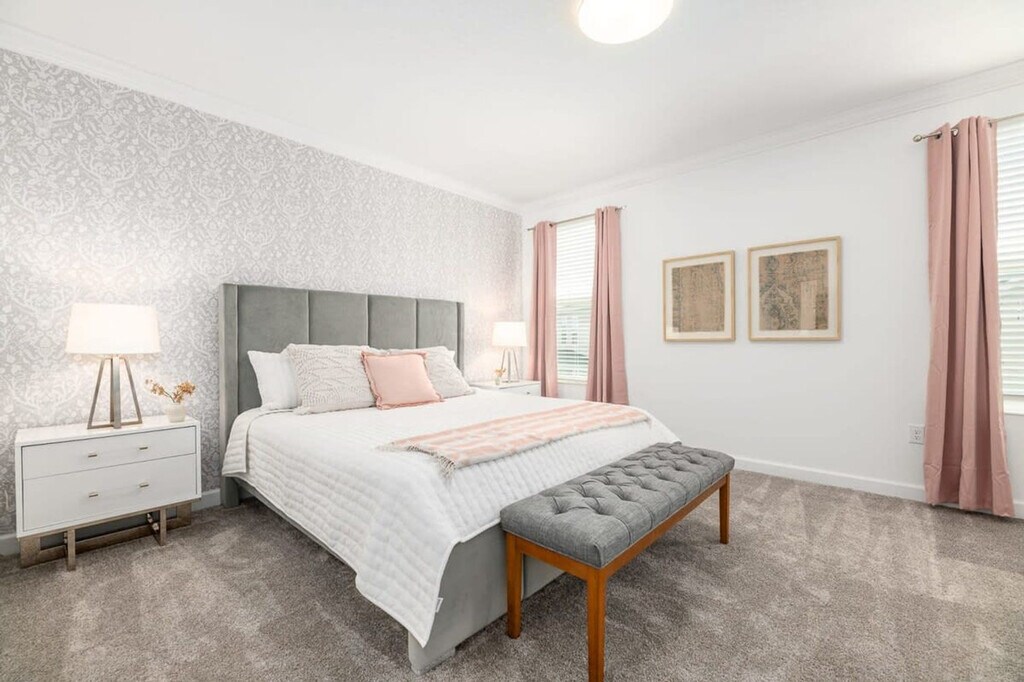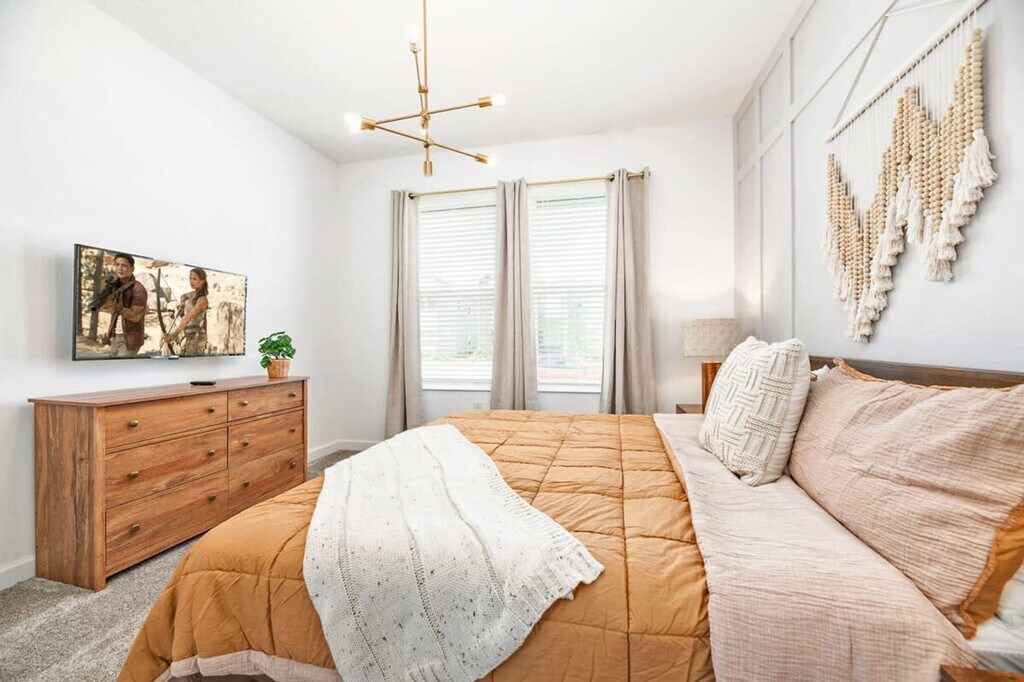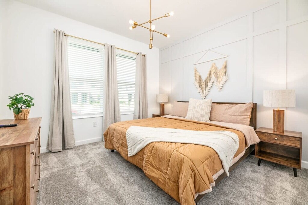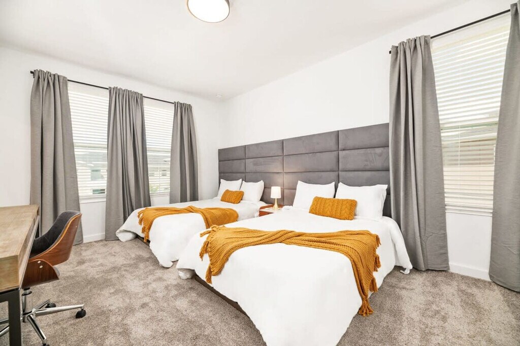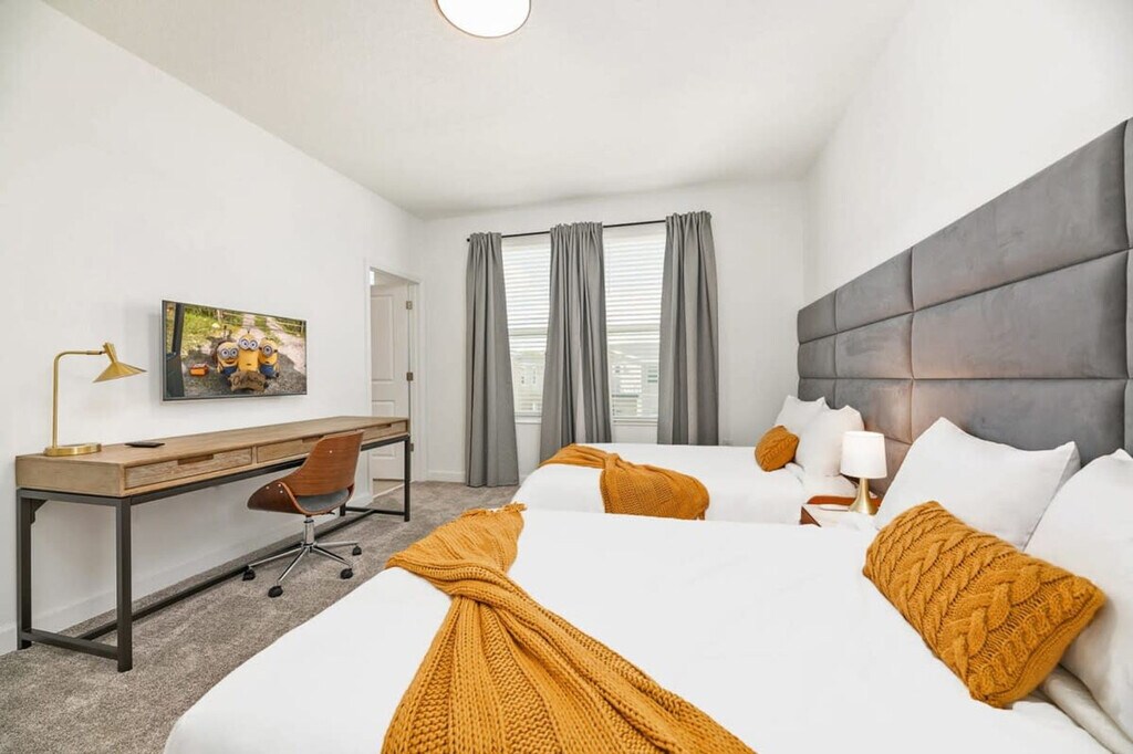 Experience the perfect vacation in this luxurious 6-bedroom, 5-bathroom home located in Storey Lake Resort, just 10 minutes away from Disney parks. Feel at home with the comforts of a private pool and expansive living space, along with the convenience of nearby restaurants and stores. Gather friends and family in this beautiful home-away-from-home for an unforgettable getaway. This 6-bedroom, 5-bathroom holiday home boasts modern décor and luxurious amenities, including a private and heatable pool, a patio with a barbecue grill, a spacious and modern living and dining room, and a fully equipped kitchen. The first floor offers a king bedroom and a bathroom. Upstairs, five additional bedrooms await your family with their own private décor and bathrooms. The master king suite, a Star Wars-themed bedroom with a full bed and its own private bathroom, a suite with two full beds and its own bathroom, a Mickey-themed bedroom with a full and a twin bed, and a Stitch-themed bedroom with a full bed share a full bathroom. Relax in the Disney-themed family room equipped with games and a laundry room with a washer and dryer. Enjoy free WiFi and free parking in a covered garage space, as well as a welcome package of basic bathroom and kitchen supplies. Heating the pool is a paid service and there is a fee charged to use the barbecue grill. Storey Lake Resort is perfectly located just 10 minutes from all major attractions and theme parks in Orlando, including Walt Disney World, Universal Resort, and Sea World. Enjoy fantastic resort amenities for the whole family, such as a tiki bar, a resort-style pool with slides and a lazy river, a sports court, mini-golf, kayaking, and a fitness center. There are two clubs inside the property, one featuring a themed pirate pool that kids will love, just walking distance from the house. Situated just off Osceola Parkway, the resort offers easy access to restaurants, shopping, and supermarkets, all within a 5-minute drive. Quiet hours are between 22:00 and 8:00. Replenishment of bathroom and kitchen amenities is the guest's responsibility. [SI]