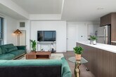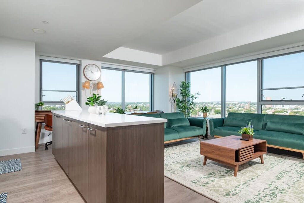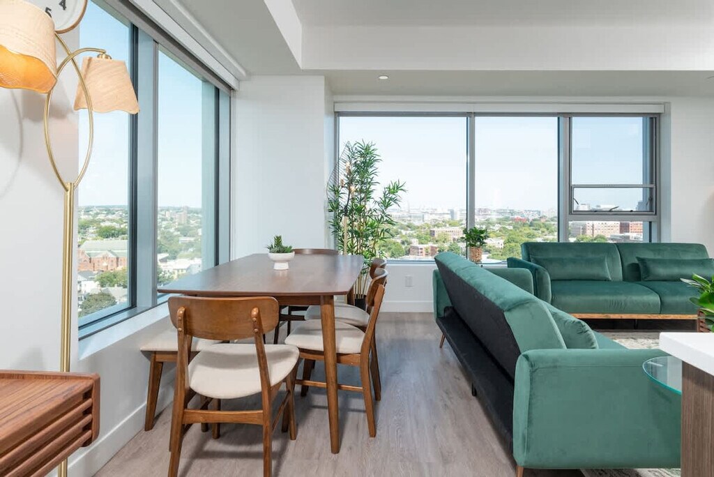 Experience modern comfort in this stunning penthouse retreat in Cambridge, offering breathtaking city skyline and river views from every window. This luxurious apartment features a king, queen, and twin bedrooms, ensuring restful nights. Enjoy shared building amenities, including a gym, meeting rooms, and welcoming seating areas. Elevators provide easy access to this exquisite home. Step into a haven of comfort where every detail is thoughtfully designed. The living room seamlessly blends with the kitchen and dining area, featuring a 60" HDTV with Roku for immersive entertainment. The fully equipped kitchen is ready for culinary adventures, and the stylish dining area invites gatherings around a chic table. Retreat to the king and queen bedrooms, each a sanctuary of rest. The apartment offers a shared gym, meeting rooms, and seating areas for communal comfort and connection. Additional guests may be accommodated for an extra fee. Nestled in the heart of Cambridge, this penthouse offers swift access to key destinations like Kendall/MIT, Harvard Square, and Downtown Boston. The proximity to Logan International Airport and major medical centers ensures convenience. Explore top attractions like Fenway Park and the Museum of Science within a short drive, and savor local culinary gems like The Helmand and Tatte Bakery & Cafe. Quiet times are from 9pm to 9am. No smoking and no events are allowed, with violators subject to a $1000 fee. Upon check-out, please leave the keys on the kitchen counter and send a photo. Do not lock the door. All guests over 18 are required to submit a copy of their ID prior to access. The apartment includes Wi-Fi and a work desk, providing a convenient set-up for remote work. [SI]