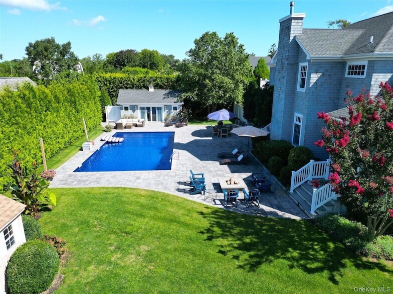 Introducing a coastal charm vacation home in Remsenburg, offering 4 Bedrooms and 5 Bathrooms including a spacious second floor balcony. The gourmet Kitchen with center island flows into a spacious dining and living area, complete with a fireplace, offering cozy yet elegant space for gatherings. Sliding doors lead to a private backyard oasis, boarded by mature trees, and showcasing an in-ground pool surrounded by pavers. The private outdoor space features fully equipped outdoor kitchen with BBQ. A pool/guest house adds convenience, while the fire pit, lounge chairs and outdoor dining create the setting for relaxation and entertainment.