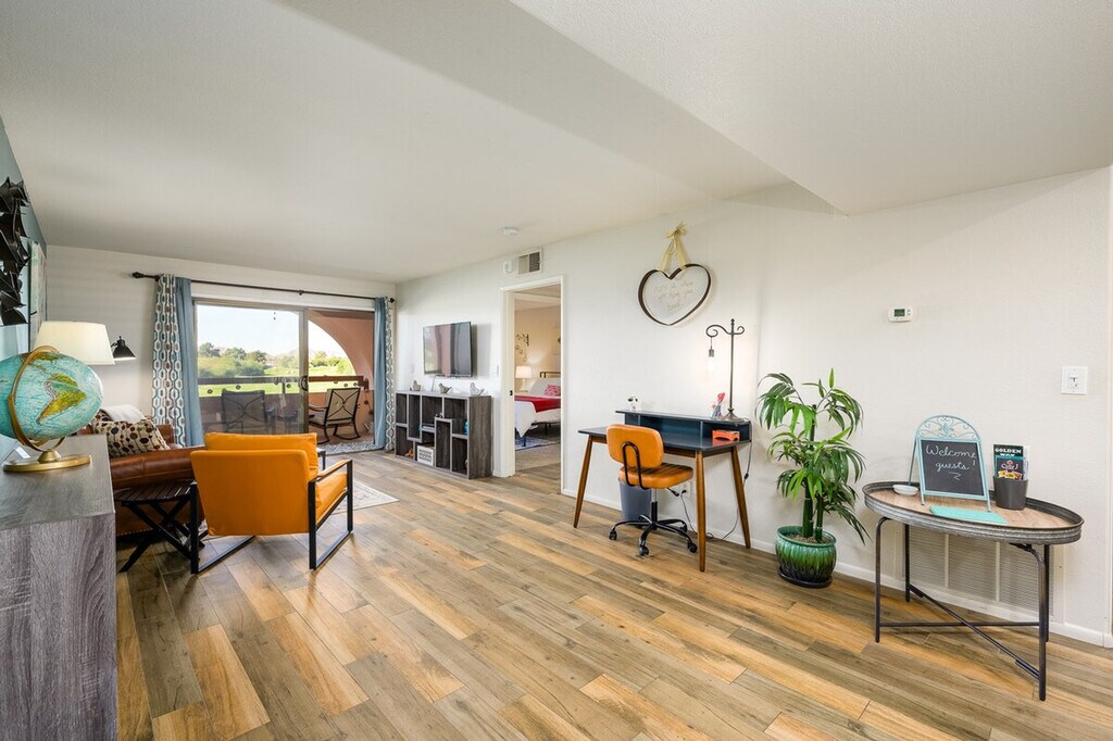 Welcome to Villa Anasazi, a charming 2-bedroom apartment located on the 2nd floor with elevator access, overlooking the scenic Stone Creek Golf Course. Enjoy breathtaking golf course and mountain views from this centrally located home, close to Highway 51, golf, hiking, restaurants, shopping, and major events in the Valley of the Sun. This delightful apartment features a master bedroom with a king-size bed and television, and a second bedroom with a queen-size bed. The main room includes a desk space, and the patio is equipped with a small table and chairs for enjoying the weather and views. The apartment also offers a full-size washer and dryer, and all linens, bath, and pool towels are provided. Smart TVs are available for you to log into your personal accounts, and free Wi-Fi is included. For those traveling with pets, one pet is allowed with prior notification of type, breed, and weight. Guests are liable for any damages caused by pets. Nestled in a prime location, this apartment is within walking distance to restaurants and shopping, making it a convenient choice for exploring the area. The community offers a sparkling pool, hot tub, BBQs, pool tables, and a gym for your enjoyment. With one reserved covered parking spot and additional uncovered guest spots, parking is hassle-free. Guests are liable for any damages caused to the property. The apartment is equipped with Smart TVs only, and you can log into your personal accounts. Check-in and check-out times are flexible, and the property is non-smoking and no parties are allowed. [SI]