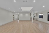 Modern day sophistication meets rustic charm in this beautifully redefined and exquisitely remodeled Ranch style home in Studio City. Light and bright open spaces allow for natural light, centered around a majestic skylight in the living room area. Expansive living room with hardwood floors and recessed lights provides an open floor plan that flows seamlessly to kitchen, dining area, and den. Sun filled galley kitchen with stainless steel appliances, soft close drawers/cabinets, quartz counter tops, and weathered brick tile floors. Kitchen is adjacent to laundry room with ample storage space, washer/dryer with topper for folding clothes and allows for direct access to two-car garage. Kitchen also overlooks quaint dining area with double sided see through decorative fireplace and leads to cozy den with high wood beamed ceilings, wood paneling and sliding door that leads to backyard. Versatile floor plan features three bedrooms and two bathrooms on the South wing of the home. Primary suite with walk-in closet, sliding door overlooking the pool and primary bathroom with tiled walk-in shower stall, double vanity sinks and soft close drawers/cabinets. Two additional well-sized bedrooms, one with built-in desk, are adjoined by an elegantly remodeled guest bathroom dual sinks and large walk-in shower stall with custom tile work. Fourth ensuite bedroom with full tub is perfect for extended family, gym, or home office. Additional features include newly updated windows and tankless water heater. Relaxing backyard with covered patio and sparkling pool round out this remodeled home in an ideal location of Studio City, just minutes from Ventura Blvd, where premier dining and boutique shopping meet proximity to major studios and top-tier schools.