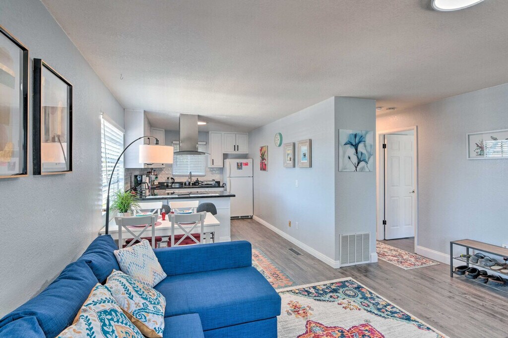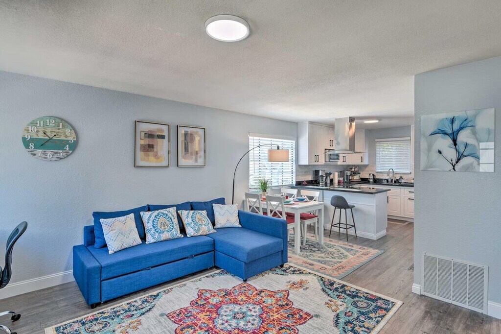 Feel at home in this bright 2-bedroom apartment in Monterey, offering sunrise views. This first-floor apartment requires climbing three steps to enter. This cozy-chic apartment features a full kitchen with modern appliances, a dishwasher, Keurig and drip coffee makers, a toaster, a water filter, cooking basics and spices, and dishware and flatware. Other highlights include a Smart TV, a fireplace, a dining table, and a walk-in shower. Linens, towels, complimentary toiletries, a hair dryer, hangers, trash bags, and paper towels are provided. Guests have access to free shared washer and dryer. Pets are welcome with a $100 fee. Designated parking spot for one vehicle is available. Take advantage of the proximity to downtown where numerous restaurants and shops await. Then, visit iconic attractions, including the renowned Monterey Bay Aquarium, and soak in some vitamin D at Del Monte Beach! Smoking, events, parties, and large gatherings are prohibited. The property does not offer air conditioning. A photo ID may be required upon check-in. Includes two desk workspaces and free Wi-Fi. [SI]