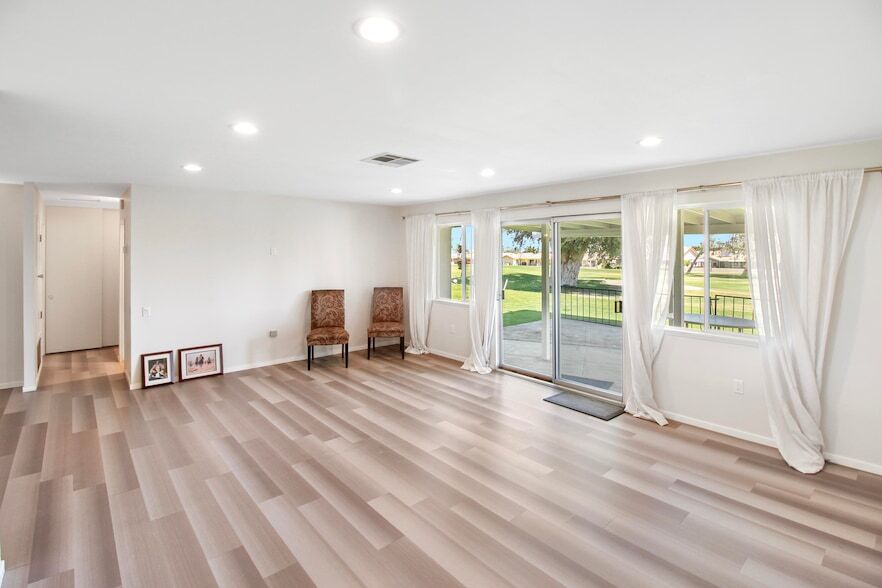 Well Maintained home on Golf Course, with 2 Bedrooms Plus a Large Converted Garage Bedroom/Bonus Room! Updated tile Plank Flooring throughout. Separate Laundry Room with Pantry Storage Shelves. Spacious Dining area adjacent to the Kitchen. Large Living Room opening to Covered Patio with View of Golf Course and East Facing Mountains. A Covered Carport Area with a Wide Driveway to allow 3 cars. Gardener service is provided by owner.