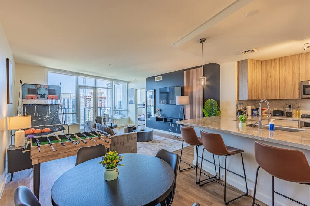 Relax and feel at home in this stylish 1-bedroom apartment located in the heart of Phoenix. This vibrant area is home to numerous award-winning restaurants, shops, historic landmarks, and attractions, making exploring Phoenix and the surrounding region easy and convenient. The living space features an innovative open-concept design that blends the living and dining areas with the kitchen, creating a modern and sleek living experience. The living room includes a sofa bed, chair, 4K 58" HDR smart TV, and coffee table. The fully equipped kitchen features a microwave, stove, oven, refrigerator/freezer, dishwasher, toaster, coffee maker with coffee essentials, electric kettle, blender, air fryer, sink with hot and cold water, glasses, silverware, pots, pans, and a dining table with chairs. The bedroom includes an office desk and chair, reading lamps, and a 43" smart TV. The bathroom is stocked with essential toiletries, including a bath with a shower, wash basin, mirror, toilet, towels, hand towels, and washcloths. One parking spot is included. Additional parking may be available in nearby garages or on the street, and details will be provided during check-in. Pets are allowed, depending on size or if they are service animals, for a fee of $20 per pet per night. There is a 2 pet maximum and only cats/dogs are allowed. Breed restrictions apply to Alaskan Mala Mute, Belgian Malinois, Boxer, Show Chow, Dalmatian, Doberman Pinscher, German Shepherds, Husky Breeds, Pit Bull Breeds, Presa Canario's, Rottweiler, Staffordshire Terrier, and Wolf Hybrid. Located in a vibrant and dynamic area, this apartment offers an urban vibe with a blend of modern skyscrapers, historic buildings, and bustling street life. Cultural attractions include the Phoenix Art Museum, the Heard Museum, and the Arizona Science Center. You'll have access to a wide range of dining options and a vibrant nightlife scene. Nearby shopping options include local boutiques and shopping centers like CityScape Phoenix. Parks and green spaces such as Civic Space Park provide a nice respite from the urban environment. Public transit options like the Valley Metro Light Rail make it easy to get around. The area is also bike-friendly and walkable, with many attractions and amenities within walking distance. The Phoenix Convention Center is nearby. Quiet hours are between 10 pm and 8 am every day. Noise complaints or any violation of this rule may result in cancellation of booking and removal from property without refund. There is a strict no-party policy, and if there is a party of any kind, the police will be called and everyone will be removed from the property with no refunds. No unauthorized guests are allowed at the unit, and there is a $100 fine per guest if discovered. Smoking is prohibited without exception on this property, and if any signs of smoking are found in the unit or on the premises, a fine of $500 will be imposed. If you are found to have brought pets without prior notification, there will be a $500 fee. There are noise monitors installed in the unit that measure noise levels in decibels, and if tampered with, there will be a fee. Each unit will be issued only one key fob for the entire group to access the building. You may be charged extra for cleaning if the property is left in a state that necessitates additional cleaning. Lost or unreturned keys will incur a $500 fee. For delayed checkout, there will be a $500 late checkout fee. If you are bringing a pet(s), please let us know beforehand for the fees, otherwise there will be a fine of $500 if discovered. [SI]