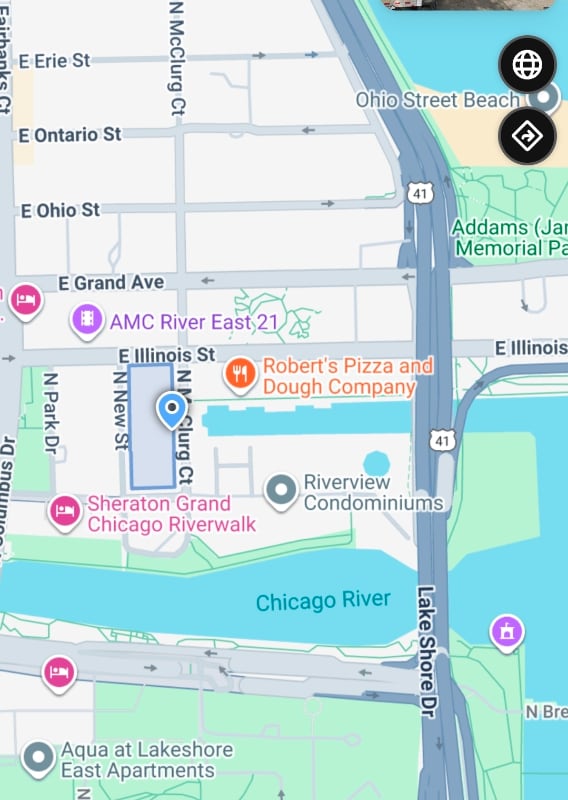 Está localizado en el barrio Streeterville, 440 N McClurg Ct en el código postal 60611 de Chicago, IL.