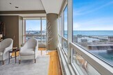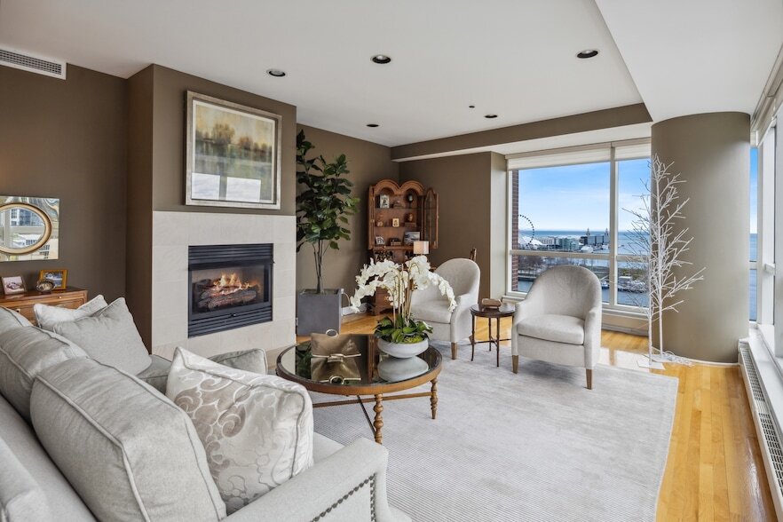 South- and east-facing 2,112 sq ft corner residence at Riverview Condominiums. This expansive two-bedroom home showcases stunning lake and river views, filling the space with abundant natural light throughout the day. The spacious living room is ideal for entertaining, featuring hardwood floors and a cozy fireplace-perfect for relaxing evenings. The large kitchen offers an abundance of cabinetry, a generous island, stainless steel appliances, and a Sub-Zero refrigerator. A dedicated dining area enhances the home's open, comfortable flow. Both bedrooms are situated on the east side of the residence. The primary suite features a wall of windows, hardwood floors, and a walk-in closet. The primary bath includes double vanities, a spacious walk-in shower, and a dedicated vanity/makeup area. The second bedroom provides excellent flexibility as a guest room, home office, or den. A separate laundry room with side-by-side washer and dryer and additional storage adds everyday convenience. One parking space is included. Residents enjoy a professionally managed building with 24-hour door staff, a fully equipped fitness center, hospitality room with catering kitchen, indoor pool with sundeck and outdoor lounge, car wash station, and package delivery services. Available for move-in June 15, 2026.