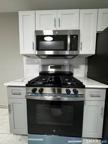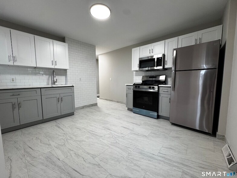 Be the first to live in this beautifully renovated 3-bedroom, 1-bathroom home offering 1,200 square feet of stylish, modern living. Every inch of this rental has been thoughtfully updated, combining timeless finishes with contemporary upgrades to create a bright and welcoming space you'll be proud to call home. Step into the spacious eat-in kitchen, where crisp white upper cabinets contrast perfectly with modern gray lowers, accented by sleek subway tile backsplash and stainless steel appliances - including a gas stove, built-in microwave and stainless steel fridge. The expansive layout offers plenty of counter and storage space for cooking and entertaining. The bathroom features a brand new walk-in shower with elegant tile work and a frameless glass sliding door. A modern vanity, chrome fixtures, and hexagonal floor tile complete the fresh, upscale feel. Each of the three bedrooms is generously sized with large windows that bring in tons of natural light. New wide-plank luxury vinyl flooring runs throughout the home, complemented by soft gray walls and crisp white trim for a clean, sophisticated aesthetic. This home is move-in ready and perfect for those who appreciate quality craftsmanship and modern design. Don't miss this opportunity to enjoy brand-new everything in a charming and conveniently located home!