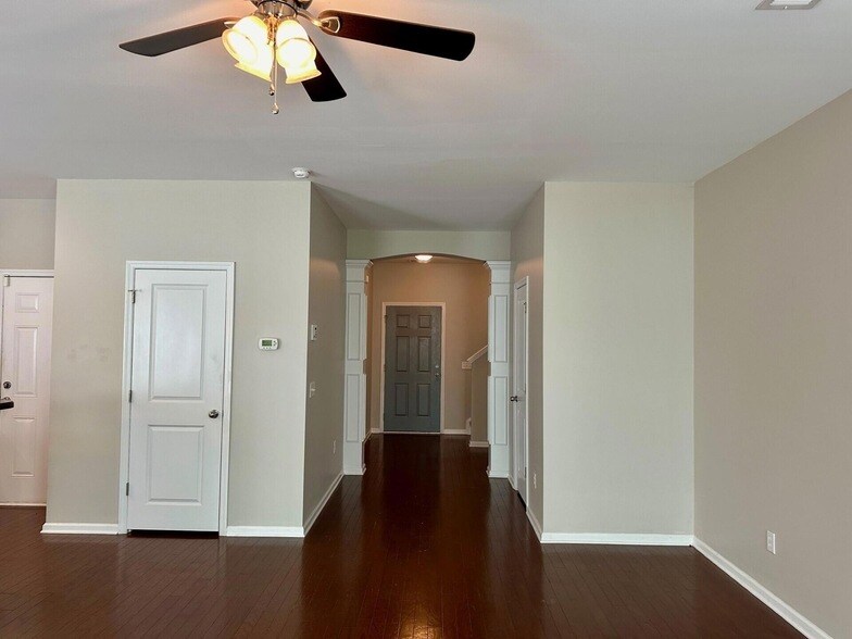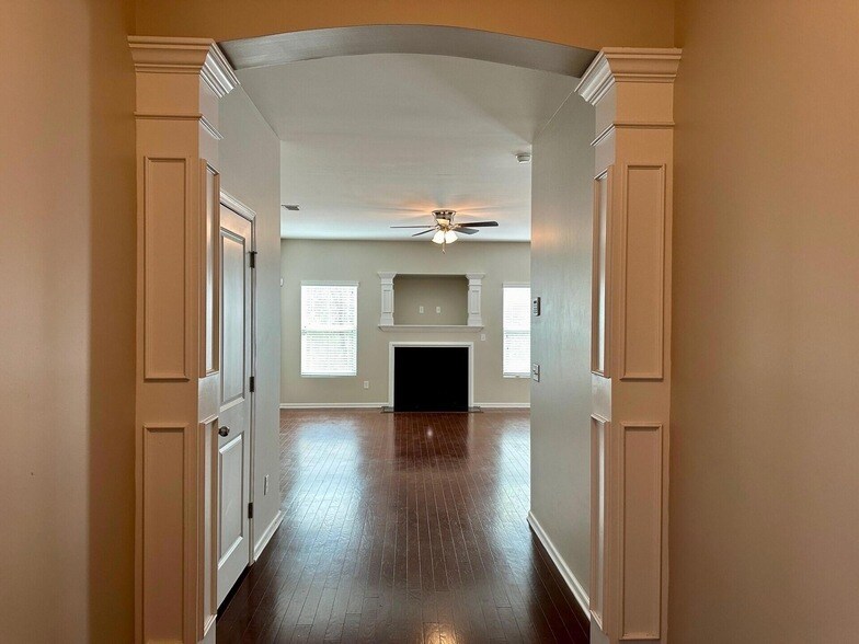READY NOW AND LOOKS GREAT! A great home located on a nice lot with trees in the rear. This open floor plan offers a large living room/dining room combo with a gas log fireplace The kitchen overlooks the living room & has beautiful sile-stone countertops & stainless appliances. Hardwood floors flow throughout the downstairs. There's a big loft upstairs surrounded by 3 large bedrooms including a master suite entered through French doors. The large master suite has a trey ceiling, deluxe bath, and large walk-in closet with built in shelving. The laundry area is also upstairs. This home is in great condition and has a nice size yard. No Smoking.