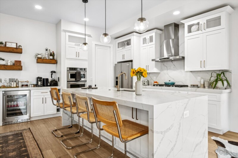 Property Id: 2381757 Offering 2,764 finished square feet of thoughtfully designed living space, this stunning contemporary residence blends modern architecture, upscale finishes, and a highly functional layout. Upon entry, the home impresses with soaring ceilings, abundant natural light, and a striking modern staircase anchoring the open-concept design. A custom wood-paneled feature wall, rich wood flooring, expansive windows, and sliding glass doors create warmth while enhancing the airy indoor-outdoor feel. The main level features seamless flow between the living, dining, and kitchen spaces—ideal for entertaining and everyday living. The kitchen serves as a true centerpiece with quartz countertops, sleek cabinetry, a generous island, pantry, modern stainless appliances, and a wet bar for elevated hosting. A desirable main-level bedroom offers flexibility for guests, a private office, or multi-generational living, complemented by a conveniently located bathroom. Upstairs, three additional bedrooms provide comfort and privacy. The upper level includes a beautifully appointed primary suite with high ceilings, a walk-in closet, private deck, and spa-inspired five-piece bath. Two additional full bathrooms and a dedicated laundry room add convenience. In total, the home offers four bedrooms and four bathrooms (three full, one half). All windows are outfitted with elegant Hunter Douglas roller shades. Standout features include private rooftop and main-level decks—perfect for morning coffee, sunset views, or evening gatherings. Additional highlights include forced air heating, central A/C, a private landscaped backyard, and an attached two-car garage. Ideally located minutes from LoHi, Tennyson, downtown Denver, parks, restaurants, and coffee shops, this Sunnyside home offers exceptional design, livability, and location.