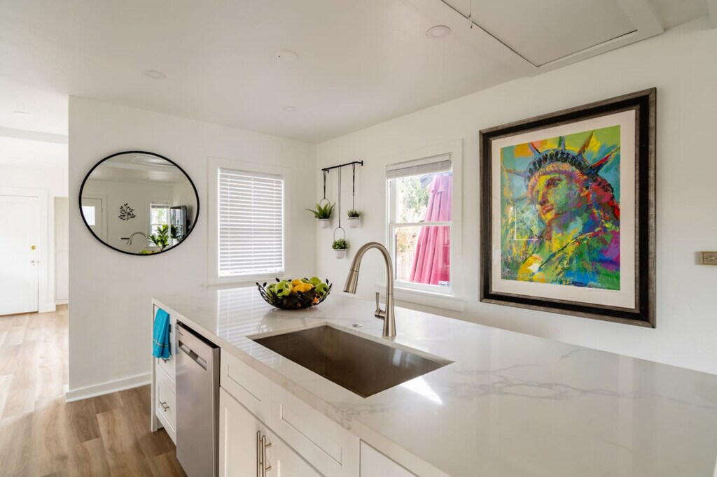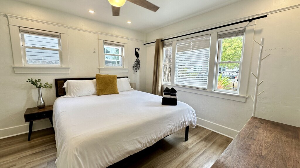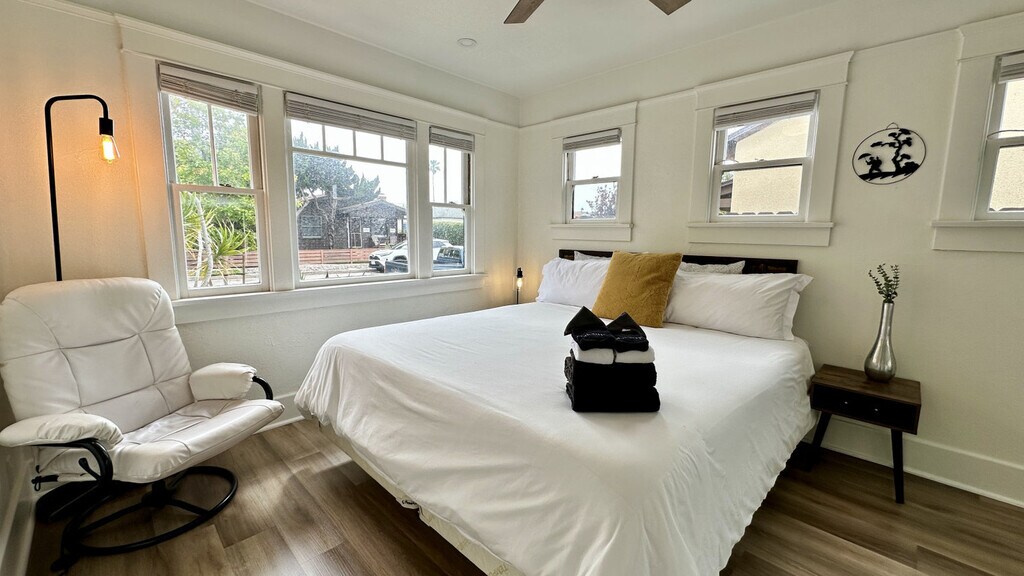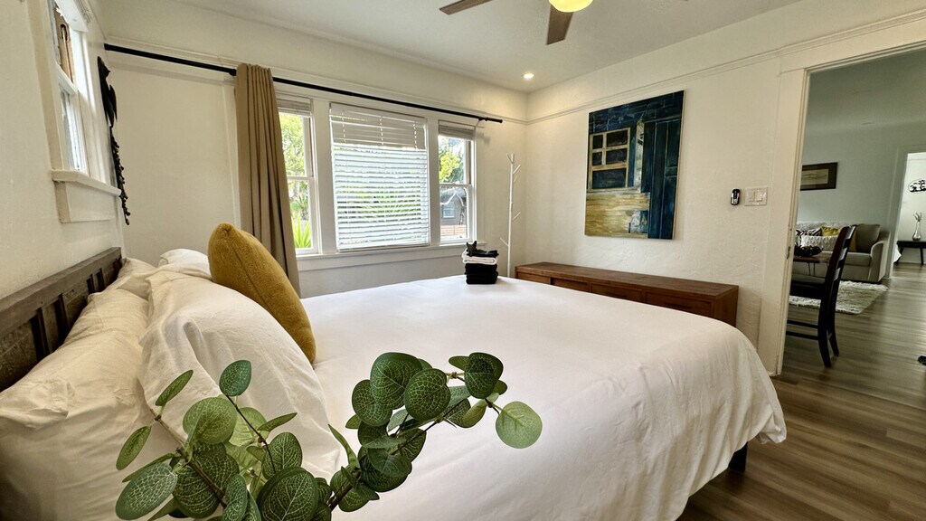 Welcome to the bright and breezy Lotus Lodge, located just blocks from Ocean Beach. This cozy retreat is perfect for relaxing by the shore or enjoying San Diego’s endless sunshine and local gems. The apartment features two Tempurpedic California King beds, a super comfy sofabed, and a queen-sized inflatable mattress available on request. The fully equipped chef's kitchen includes stainless steel appliances, a blender, a coffee maker, an air-fryer, a toaster, and a wine rack. The kitchen island is perfect for gathering, and the 2-room layout includes all essentials. Enjoy the private patio with bistro lights, a gas grill, and fresh lemons from the garden. Family add-ons are available, including early check-in, late check-out, Pack 'n Play crib, beach wagon, surf and boogie boards, and car rentals. Pets are welcome with a $100 fee per pet per stay. Please keep pets off the beds, comforters, and sofas to avoid extra cleaning or replacement fees. Undeclared pets will incur a $200 fee per pet. Explore San Diego’s top attractions within minutes, as the apartment is located 5 blocks from Ocean Beach and 10 minutes to Balboa Park, the San Diego Zoo, SeaWorld, and Downtown. You are just steps from local breweries, cafes, and Ocean Beach People’s Organic Co-op Grocery, perfect for soaking in the San Diego lifestyle. For the safety and security of guests and neighbors, the exterior of the home is monitored 24/7 by video and audio. The property is equipped with a device that monitors the environment inside, including noise levels, temperature, and motion. Quiet hours are from 10 p.m. to 9 a.m., and no parties are allowed. Undeclared guests will be charged $65 per person if not disclosed. Smoking indoors will incur a $200 charge. A utility cap of $200 applies for monthly guests, with guests responsible for any overages. You may occasionally hear planes overhead, and earplugs are suggested for light sleepers. On-site support is available, as the owner and handyman live in the back units. The apartment offers gigabit Wi-Fi for remote work and a 70” smart TV with all the popular streaming options, including Disney+, Netflix, Apple TV, Hulu, and Amazon Prime Video. USB plugs are available in every bedroom. Registration Number: San Diego TOT#: 640970
