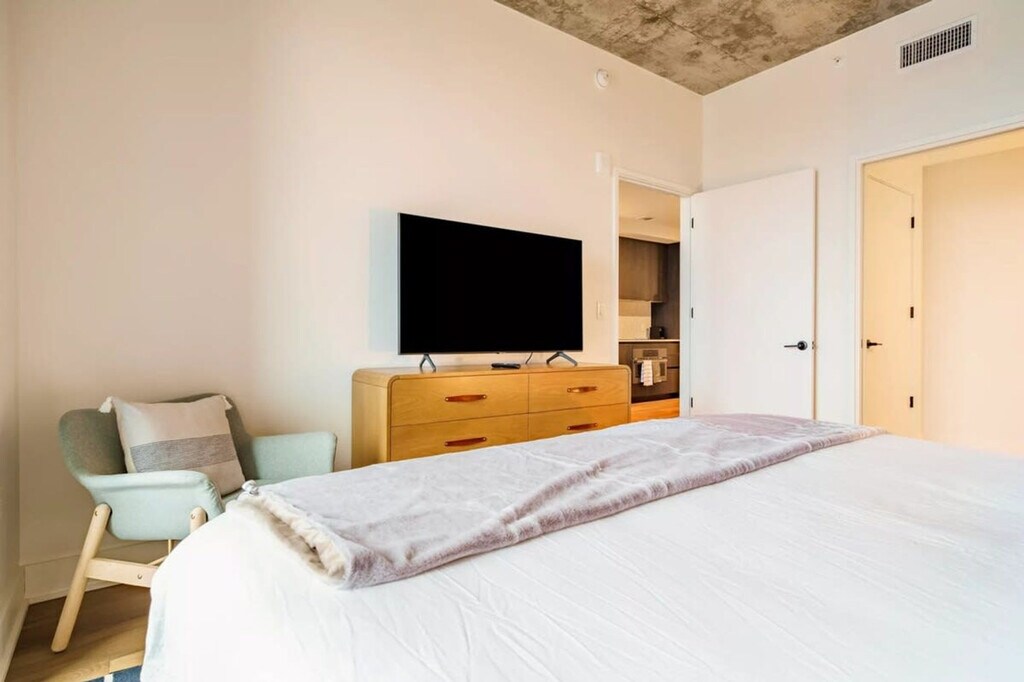 Welcome to Stylish Natiivo, a one-bedroom apartment (675 sq ft / 62 sqm) located on the lively Rainey Street in Downtown Austin. This prime spot offers you a blend of comfort and convenience. Start your day with fresh pastries and nitro brew in the stylish lobby or relax in the tranquil courtyard with friends. For a more luxurious experience, head to the rooftop pool and enjoy breathtaking views. The building offers top-notch amenities, including a gym, a pool, a clubhouse, and a dog park. Upon entering the home, you'll be greeted by a spacious and inviting open floor plan where the kitchen, living room, and dining area seamlessly flow together. Floor-to-ceiling windows offer stunning views that beautifully blend the cityscape with the natural surroundings. The living room features a comfortable sofa with a sofa bed, while the sleek, full-sized kitchen is equipped with elegant black stainless steel appliances. The master bedroom is a generous retreat with a king-size bed, a flat-screen TV, and direct access to the balcony. From the 26th-floor balcony, enjoy panoramic city views and captivating scenes of Lady Bird Lake (Lake Austin). The bathroom is designed for comfort and style, featuring a walk-in shower and dual vanities. Additionally, a full-sized washer and dryer are conveniently located within the apartment. Pets are welcome with an extra fee. During your stay, you’ll have access to all of the community’s amenities including the gym, pool, and lounge area. Valet Parking on site is provided at an extra cost. The Rainey Street Historic District is a street of historic homes, many of the bungalow style, in downtown Austin, Texas. Rainey Street is positioned near Lady Bird Lake and Interstate 35 in the southeast corner of downtown. Parties are not permitted at this home. There is a communal laundry room for all guests to use. You may be asked to provide a copy of your official government-issued photo ID, confirm your contact information, and, in some instances, complete a criminal background check. Check-in instructions might be withheld until you have successfully completed the verification process. [SI]