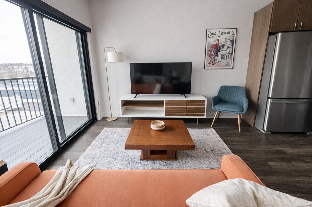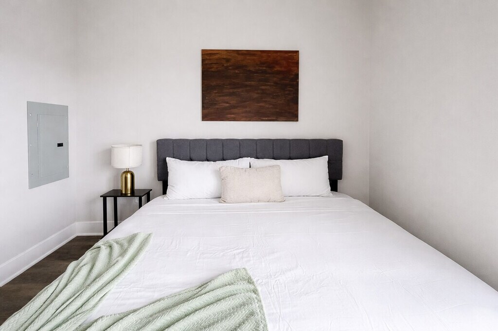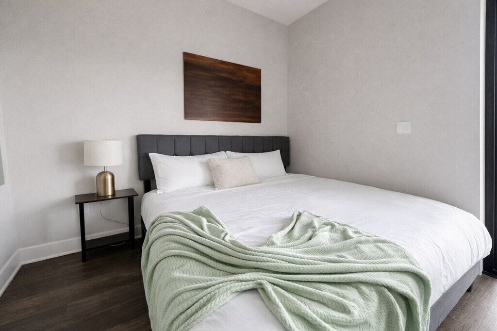 Feel at home in this luxurious loft apartment that comes fully furnished. The unit includes a full living room area, kitchen, bedroom, bathroom and in-unit laundry area. This apartment comes fully furnished with all the best amenities, toiletries and complementary goods to make your accommodation an unforgettable experience. The complex features plenty of opportunities for relaxation and recreation, including keyfob access, a fitness center and a sauna! Guests have access to the fitness center, sauna, and the seasonal pool. Street parking is available. You cannot receive mail here. This is an apartment building and we do not have any control over the availability or quality of the amenities such as the elevator, fitness center, sauna, or seasonal pool. These amenities may be unavailable due to cleaning, maintenance, or other unexpected factors, and a refund will not be issued if any of the amenities are unavailable during your stay. Additionally, the building itself is not managed by our trusted partner, and therefore anything outside of the unit is not maintained by the partner. [SI]