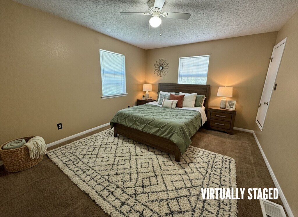 View 360 Virtual Tour: This 2 bedroom 1.5 bathroom townhome includes a fireplace in the living room, matching appliances, and ceiling fans throughout. The half bath is located downstairs, with both bedrooms and the full bath upstairs. Carpet is featured in the bedrooms, and washer and dryer hookups are included for your convenience. Come by our office to see this property today. Disclaimer: The furnishings or enhancements shown are AI-generated and intended for inspiration only. They may not reflect the actual scale, condition, or current features of the property.
