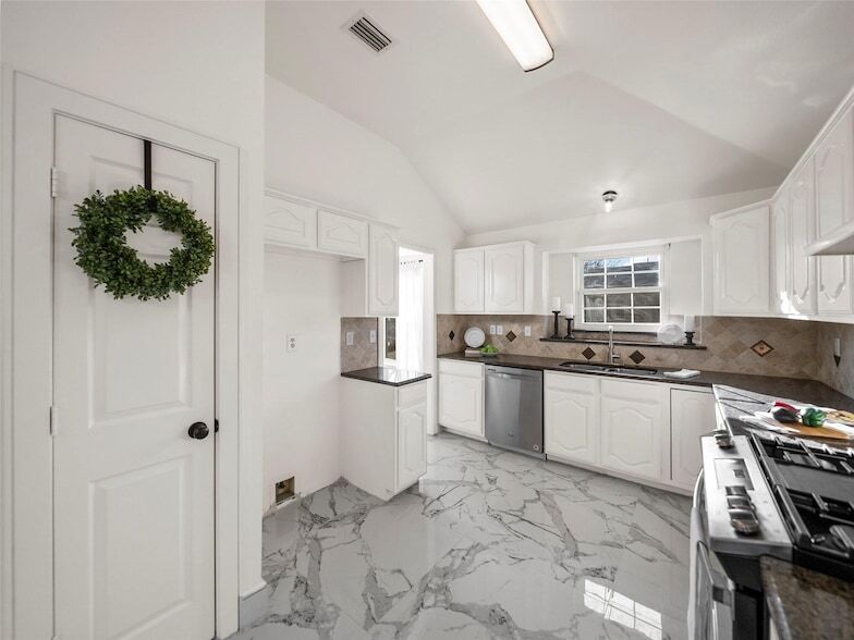 Elegant home on a quiet cul-de-sac just minutes from Lake Ray Hubbard. This move in ready home features an open layout with elevated ceilings and striking 32x32 marbled porcelain tile throughout most of the home. The spacious living room showcases an L shaped gas fireplace and a wall of windows filling the space with natural light. The kitchen offers granite countertops, tumbled stone backsplash, a gas range, and generous storage, opening to a charming breakfast area with window seat. A versatile formal dining room can also serve as a study. The private primary suite boasts a cathedral ceiling, double vanities, garden tub, separate shower, and a custom walk in closet. Split secondary bedrooms share an updated hall bath. Outdoors, enjoy a covered and extended patio overlooking a large fenced yard with an 11x10 storage shed. Additional highlights include 2022 HVAC, energy efficient windows, and excellent access to parks, shopping, dining, George Bush, and I-30.