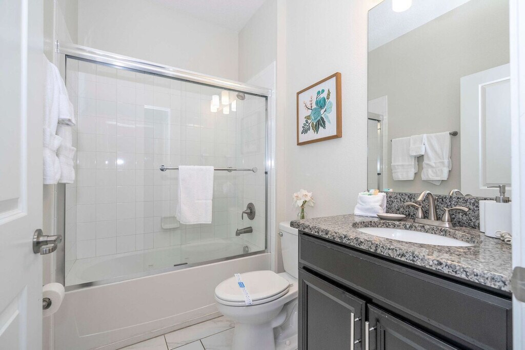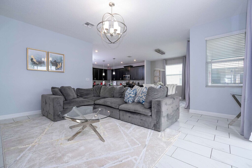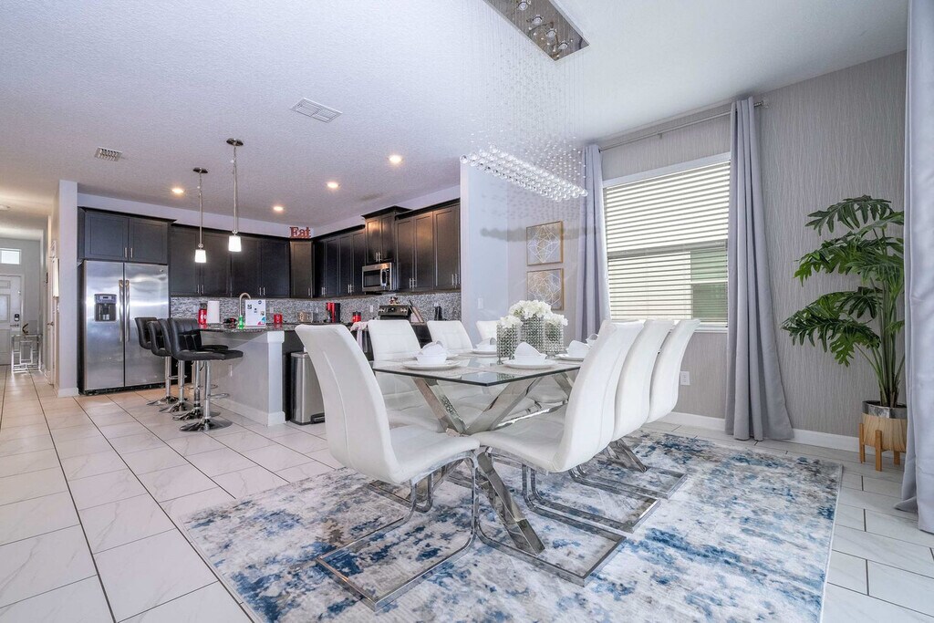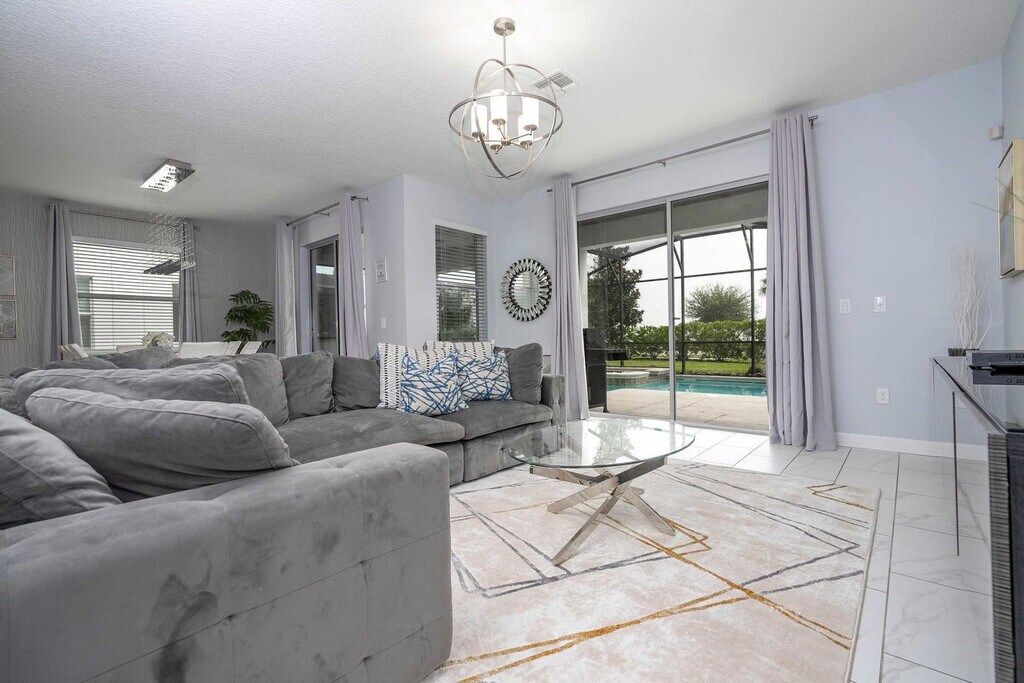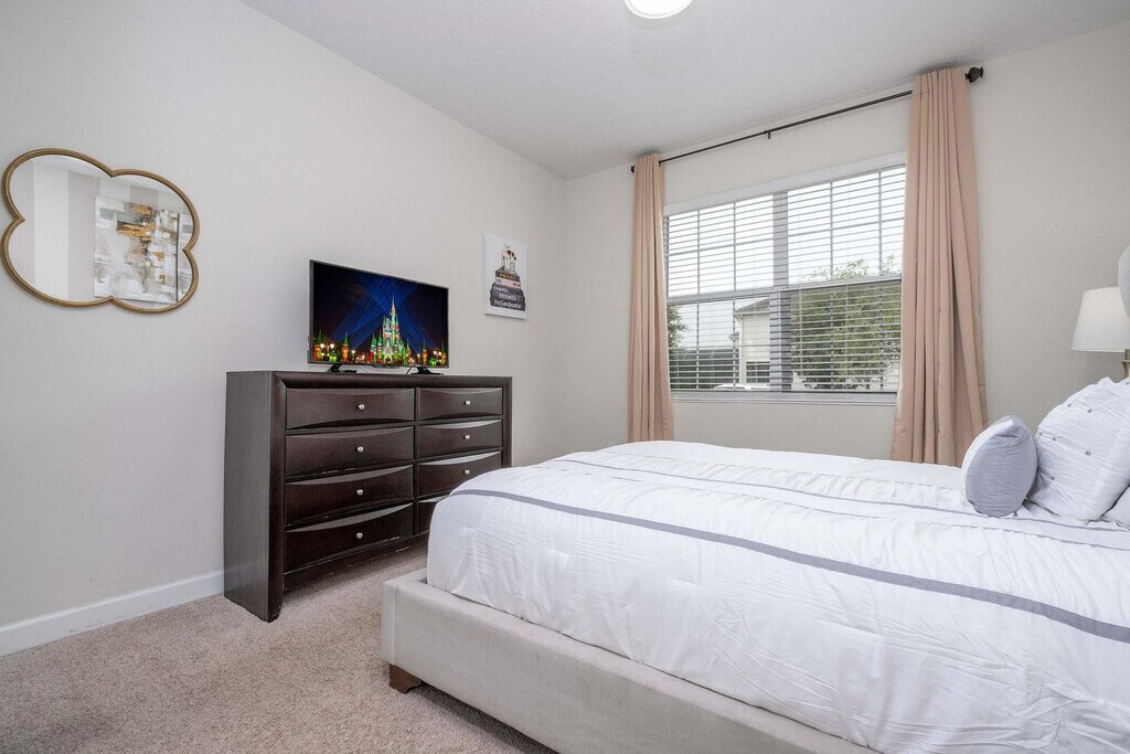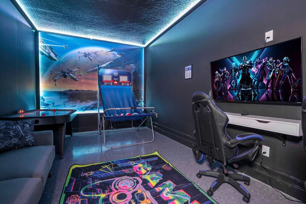 Escape to an exceptional retreat in this beautifully designed 6-bedroom, 5-bathroom home located in Storey Lake Resort, just 10 minutes from Disney parks. Perfect for families and groups, this home features a private pool, a spacious living area, and themed spaces to delight guests of all ages. Enjoy the amazing Star Wars-themed game room, Minion's family room, and themed bedrooms, including a Mickey room and a Heroes room, designed to add fun and excitement to your stay. With its convenient location near dining, shopping, and entertainment, this home offers the perfect base for creating unforgettable memories with your loved ones. Welcome to a family-friendly 6-bedroom retreat, perfectly designed to create unforgettable memories. With space for up to 17 guests, this home is ideal for families, offering a mix of comfort, fun, and thoughtful design. The open-plan living room flows seamlessly into the dining area and a fully equipped kitchen, providing the perfect hub for meals and relaxation. This home truly shines with its themed spaces, perfect for families with kids and kids at heart. Explore the magic of Mickey, Star Wars, and Heroes-themed bedrooms that ignite imaginations. The Minions-themed family room on the second floor, complete with a sofa bed, adds extra entertainment value, while the Star Wars-themed game room ensures fun for all ages. The first floor features a cozy queen bedroom with a bathroom, offering convenience and privacy. Upstairs, the master king suite and an additional king bedroom suite provide comfort and relaxation. The Mickey-themed bedroom includes a bunk bed (full and single), plus a trundle bed (single). The Star Wars room has a bunk bed (double and single) with a trundle (single), and the Heroes-themed room features two single beds. These two themed bedrooms share a bathroom, ensuring space and comfort for everyone. Outdoors, the private heatable pool offers a great spot to unwind, while the patio is perfect for family time. Additional conveniences include a laundry room with a washer and dryer, free Wi-Fi, complimentary parking, and a welcome kit with essentials to get you started. This home is the ultimate choice for families seeking a fun, comfortable, and convenient stay near Orlando’s top attractions. Guests are responsible for replenishing amenities during their stay. Pool heating and barbecue grill use are available for an additional fee. Storey Lake Resort has the perfect location just 10 minutes from all major attractions and theme parks in Orlando, including Walt Disney World, Universal Resort, and Sea World. You will find fantastic resort amenities for the whole family to enjoy with a tiki bar, a resort-style pool with slides and lazy river, sports court, mini-golf, kayak, and fitness center. There are two clubs inside the property, one of them with a themed pirate pool that kids will love is just walking distance from the house. Located just off Osceola Parkway, the resort has easy access to restaurants, shopping, and supermarkets, everything within just a 5-minute drive. Quiet hours are between 22:00 and 8:00. [SI]