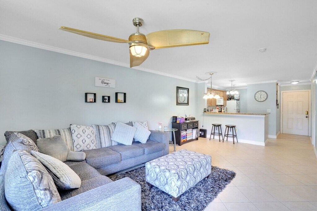This bright and well-maintained unit offers an open layout with diagonal tile and laminate flooring, crown molding, and a spacious kitchen featuring granite countertops, a breakfast bar, and a stackable washer and dryer for added convenience. The primary suite includes a generous walk-in closet with built-ins, and the screened patio provides a comfortable outdoor space to unwind. AC 2020. Listing courtesy of Realty ONE Group Innovation. Please call Anthony with Ideal Lifestyles Real Estate at .