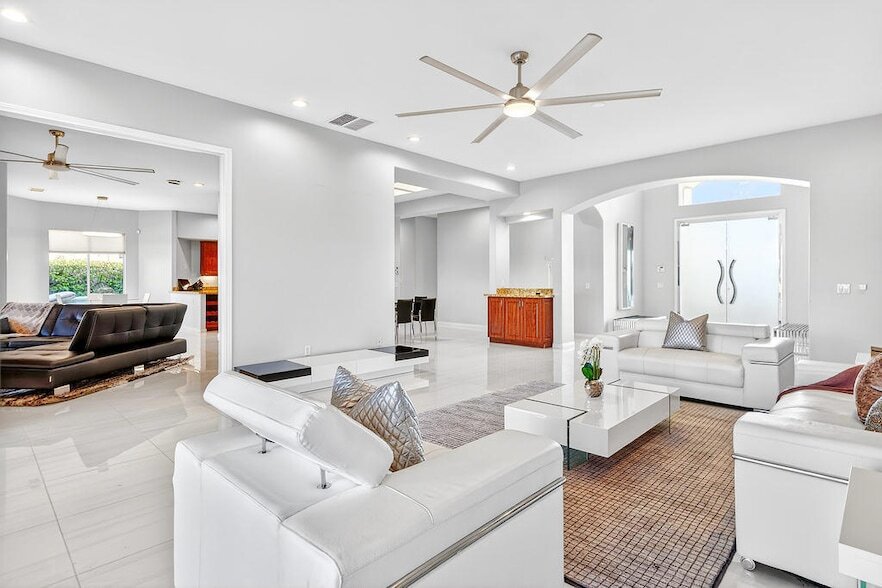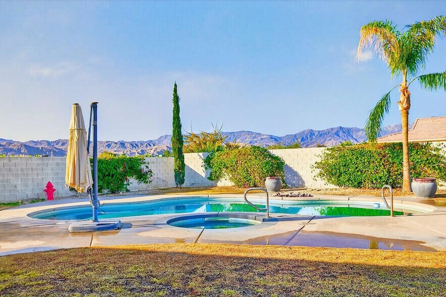 Annual lease. A luxury home on a cul-de-sac near Eisenhower Medical Center. This 3789 Sq Ft home has 4 bedrooms 3.5 baths and sits on a huge lot with mountain views. Located in the IID lower utility cost district. Beautiful double door glass entry. Spacious open floor plan. The island kitchen has a gas cook top, granite countertops, double ovens, breakfast bar. The primary bedroom suite has a fireplace and a retreat with built-in bookcase. The over-sized back yard has covered patio, fire pit, built-in BBQ and custom saltwater pool & spa. 3-car garage. Basic tv cable, HOA fees, pool + landscape service are included. Tenants pay utilities + screening fee. Owner will consider Seasonal Vacation rental terms at $11,000mo. *Professional photos coming after refrigerator is installed and bed is installed in guest bedroom. Contact agent to schedule your personal showing