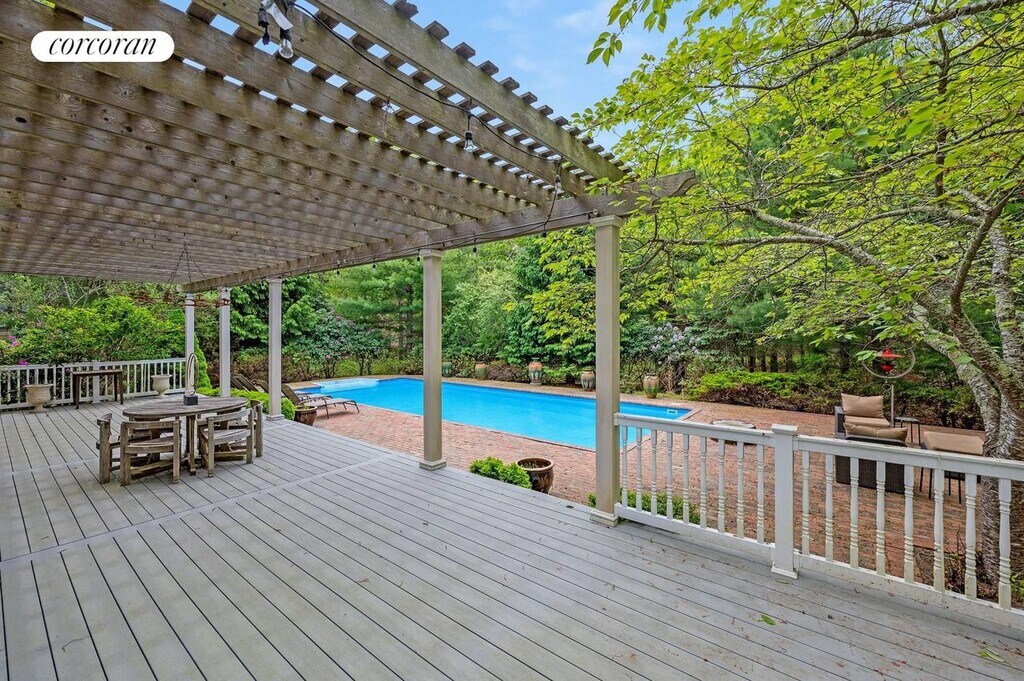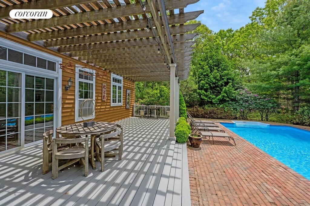 Recharge and rejuvenate in this private retreat, perfectly nestled within a quiet cul-de-sac on a lush, secluded 1.5-acre property. Enter through the white gated driveway and feel an immediate sense of privacy and calm .Upon entering the home, you're welcomed by soaring ceilings and expansive windows that flood the first floor with natural light. The open-concept layout offers a seamless flow between the bright living room, kitchen, and dining area-all overlooking the pool and landscaped gardens. A spacious den and a full bathroom complete the main level, along with an oversized wrap-around deck ideal for relaxing or entertaining guests. Upstairs, the generous primary suite features high ceilings and abundant space. Three additional bedrooms and a well-appointed bathroom provide ample accommodations for family and visitors. The beautifully landscaped pool area offers the perfect balance of sun and shade, creating a resort-like setting for lounging and outdoor enjoyment. A separate two-car garage adds convenience. Located just minutes from ocean and bay beaches, as well as shops, restaurants, and all the amenities the Hamptons have to offer, this property provides the ultimate combination of tranquility and accessibility. [[Rental Registration # 25-1095]]
