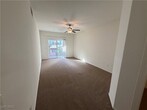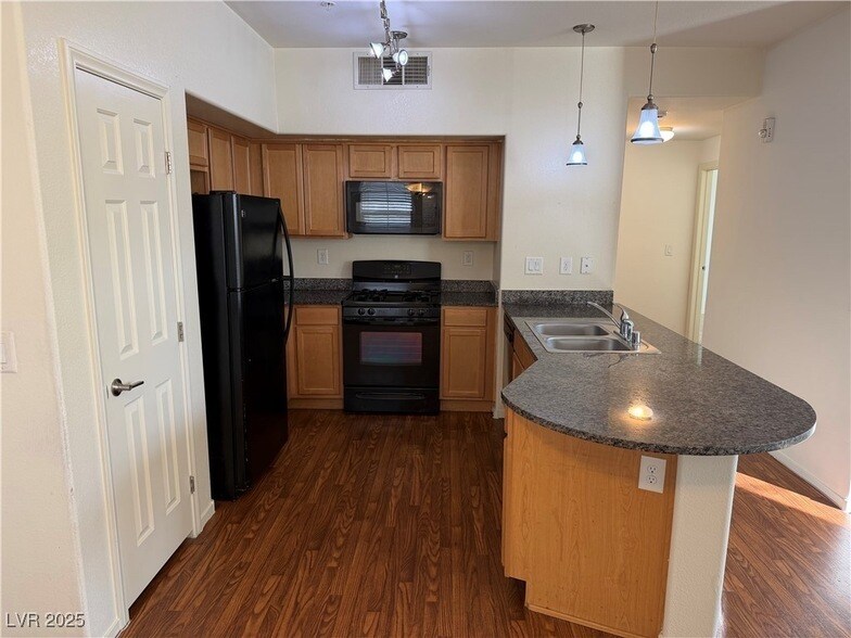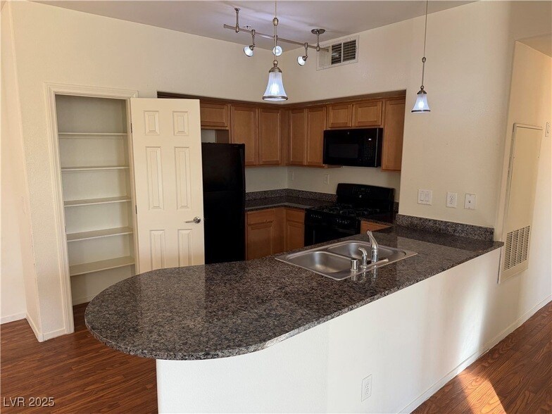Spacious 3 bed, 2 bath condo with a 1-car detached garage located in a gated community featuring a pool and spa. The kitchen offers granite countertops and black appliances, with a separate dining area for added space. Vinyl wood-look flooring covers all wet areas, and ceiling fans are installed throughout. The large primary bedroom includes private patio access, while the primary bath features dual sinks and a walk-in closet.