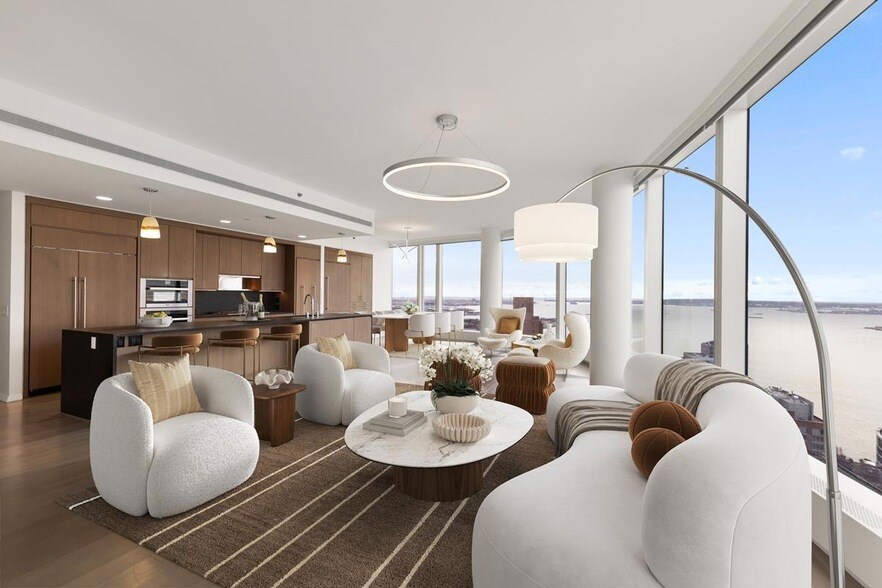 AVAILABLE Immediately!Welcome home to Residence 48 at 50 West Street Condominium an extraordinary, trophy-level home occupying half the floor and redefining luxury living in Downtown Manhattan.Spanning nearly 4,000 square feet, this rare 5-bedroom, 6-bathroom residence was masterfully created by seamlessly combining two homes, resulting in an expansive, versatile layout with exceptional privacy, light, and flow. With three of the most coveted exposures South, West, and North the apartment is wrapped in dramatic, floor-to-ceiling curved glass windows, delivering breathtaking, uninterrupted water views from every room.Wake up to shimmering water vistas and end each day with cinematic sunsets over the Hudson. Enjoy sweeping panoramas of the Statue of Liberty, Ellis Island, the East and Hudson Rivers, and the New Jersey skyline, all while benefiting from great quality windows, creating a serene sanctuary high above the city. The grand living and dining area features an open-concept design ideal for both intimate living and elegant entertaining. The chef s kitchen is sleek and sophisticated, anchored by a large island and outfitted with two Sub-Zero refrigerators, premium stainless-steel Miele appliances, and an oversized walk-in pantry a rare luxury in the city.The primary suite is a true private retreat, discreetly separated from the other bedrooms and has its own private office and second bath. It offers custom walk-in closet and a spa-like 5-pieces bathroom adorned with elegant marble finishes and heated floors. All secondary bedrooms are generously proportioned, sun-filled, and enjoy open, inspiring views.Every detail has been thoughtfully considered for comfort and ease: Lutron-controlled window shades throughout, Five-zone Nest climate control for year-round comfort, two separate, large-sized washer/dryer sets, vented outside, conveniently located on opposite sides of the residence, Wide-plank oak flooring and custom closets throughoutThis is more than a home it is a sanctuary in the sky.Residents of 50 West Street enjoy one of the most comprehensive luxury amenity packages in New York City, including: A spectacular Observatory/terrace with barbecue areas; The exclusive Water Club featuring a pool, hot tub, sauna, and steam room; A state-of-the-art fitness center with gym, spin room, yoga studio, and golf simulator; Entertainment floor with Cinema screening room, game room, children s playroom, and private event kitchen.A rare masterpiece offering scale, views, privacy, and lifestyle Residence 48 is truly one of a kind.Schedule a private showing and experience elevated living at its finest.Disclaimer: Images are virtually staged