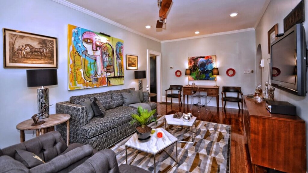 Escape to this super-luxe 2-bedroom condo on the ground floor of a historic 1920s apartment building in historic Myers Park. Feel at home in this residence that sleeps up to 6 and is located on Queens Rd, one of the prettiest tree-lined avenues in the entire city. This residence provides the ultimate in furnishings, art, and high-end finishes. The galley kitchen is fully equipped with pots, pans, utensils, a gas range with convection oven, refrigerator with ice maker, dishwasher, disposal, and a stackable washer and dryer. Off of the kitchen, a dining area seats six. The large living room features upholstered furniture for comfortable seating and a flatscreen television for entertainment. Enjoy 400-thread-count linens and thick Egyptian cotton towels. Each bedroom has a generous closet and a television. Stainless appliances with granite countertops, new heating and cooling systems, and plumbing provide modern amenities, while the original refinished hardwoods, bathroom tile, graceful arched doorways, and 2-panel doors provide the charm so often absent in new construction. Large double-hung windows let in an abundance of light in all of the rooms, and the screened porch provides comfortable outdoor living space. Charlotte’s biggest and best fitness center, the Dowd Y, is only five minutes away. Amenities include cardio equipment, weights, group classes, and swimming. A 7-day pass is $50. If you are traveling with a dog, it must be registered at a cost of $59 per dog (two maximum). If you do not register your dog, you will be charged $120 per dog. Welcome to Myers Park, a prestigious and sought-after neighborhood near Charlotte that offers an exquisite backdrop for your stay. Immerse yourself in the elegance and sophistication that defines this historic district. Myers Park is renowned for its stunning tree-lined streets, meticulously landscaped gardens, and exquisite architecture. Indulge in the vibrant culinary scene of Myers Park, where upscale restaurants, charming cafes, and trendy eateries beckon. For nature enthusiasts, Myers Park boasts enchanting green spaces and parks that provide a tranquil retreat from the bustling city. Take a leisurely stroll through the lush gardens of Wing Haven or immerse yourself in the natural beauty of Freedom Park. Myers Park's prime location grants easy access to Charlotte's most iconic attractions and cultural destinations. The streetcar to Uptown is a 10-minute walk away. Uber/Lyft are also convenient options, and many bikeshare companies offer inexpensive bikes. Wide sidewalks and towering oaks throughout the neighborhood provide an ideal place for walking or jogging, and a coffee shop, multiple restaurants (including Ethiopian, Thai, casual and fine Italian, etc.), shopping and even an independent movie theater are a half mile away. Spring through fall, a farmers market is open Wed, Fri and Sat around the corner from the apartment, and a new greenway offers a convenient connection to Freedom Park, Dilworth and Carolinas Medical Center. Quiet hours are between 10 pm and 7 am. Dogs are never allowed on the furniture or bed. If there is hair on the furniture, excess hair in the home, stains, damage, or waste found in the yard or home, you will be charged an additional fee. Only two dogs are allowed per stay unless otherwise approved. No parties, events, or large gatherings are permitted. Smoking and vaping are not allowed inside or outside the home or building. Guests must be at least 21 years old to make a reservation, and this rule is strictly enforced. Air conditioning must remain between 72 and 75 degrees in the summer and 68-72 in the winter and on AUTO to help ensure it stays in good working condition during your stay. Keep doors and windows closed as much as possible. [SI]