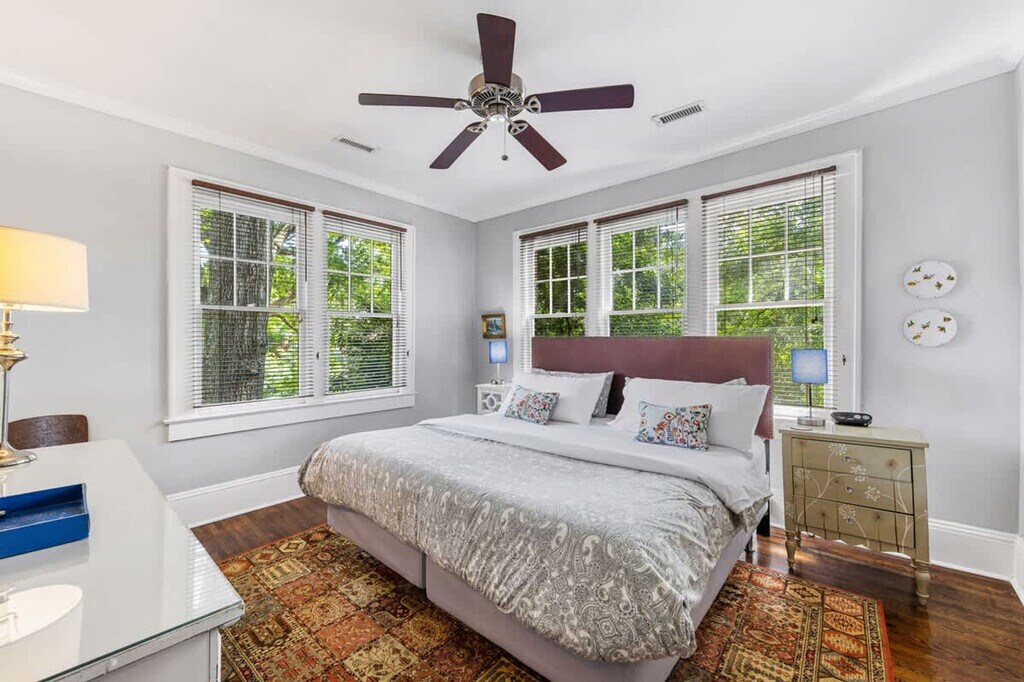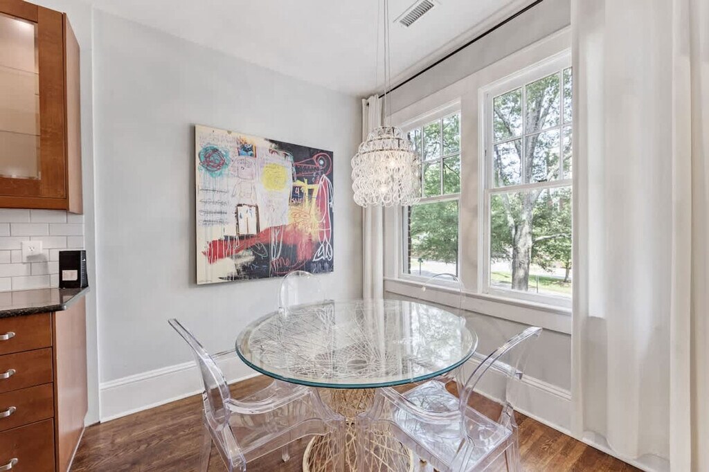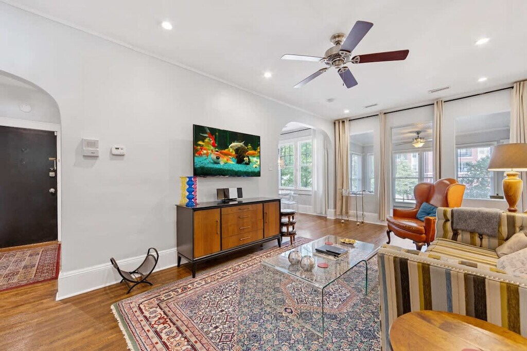 Feel at home in this Myers Park condo on the second floor of a historic 1920's building on prestigious Queens Road, offering convenient access to the Myers Park Mile, Novant Hospital, and Atrium CMC. This 2-bedroom condo has a cozy sunroom overlooking cultivated gardens and tall oaks. This condo is furnished with modern amenities including ultra-fast Wi-Fi and Hulu + Live TV. A sun porch and fully equipped kitchen create ample space to prepare meals. Large windows let light stream in. The kitchen features a gourmet gas range, a convection oven, a refrigerator with an ice maker, a dishwasher, and a stackable washer and dryer. Granite countertops complete the kitchen, which comes fully equipped with essentials such as measuring cups, spoons, mixing bowls, roasting pans, and a garlic press. The adjacent dining room comfortably seats four with all the place settings. The spacious living room features a large, upholstered sofa that pulls out into an additional bed, and a flatscreen television with streaming and Live TV. The inviting fireplace is heavenly in the cooler seasons. Enjoy the artwork by local artist Nico Amortegui. The main bedroom has a king-size bed with a television and a generous closet. The second bedroom has two twin beds and a flatscreen television. The twin beds can be pushed together to create one king-size bed. The bathroom is spotless and features plush towels. Included in the amenity package are a starter supply of bath products as well as detergents. The building has a shared patio that includes a grill, tables, and chairs. On-site parking is available. If you are traveling with a dog, it must be registered at a cost of $59 per dog (two maximum). A workstation with monitor, keyboard, and mouse is available for rent for $10.00 per day. Single beds can be joined into a king-size bed for a one-time $50 fee. A pack n’ play and/or highchair can be requested for use with at least a 24-hour advance notice. Located in historic Myers Park, Queens Road is the heart of Charlotte’s premier neighborhood replete with wide sidewalks and towering oaks throughout the neighborhood. This incredibly safe community provides an ideal place for walking or jogging, and is just a short stroll from multiple coffee shops and restaurants. Within a half mile walking distance are more than 40 locally owned restaurants (Thai, Italian, French, and Mexican), as well as Starbucks, Panera, and Old Pancake House. Charlotte’s renowned greenway is less than a half mile away. From there, you can bike, run, or walk along the 30 miles of trails. It is also very close to Freedom Park, Dilworth, Plaza-Midwood, the Atrium Medical Center (Levine Children’s Hospital and Levine Cancer Institute) and the Novant Hospital complex. Dogs are never allowed on the furniture or bed. If there is hair on the furniture, excess hair in the home, stains, damage, or waste found in the yard or home, you will be charged an additional fee. Parties, unruly behavior, loud music, disrespectful or unlawful activities are prohibited and violations will warrant forfeit of the entire reservation and may incur additional fees. Smoking any substance is strictly prohibited on the premises and may result in a $500 penalty. Quiet hours are from 10:00 pm to 7:00 am. A desk and ultra-fast Wi-Fi enable business travelers to stay plugged into their busy schedules. [SI]