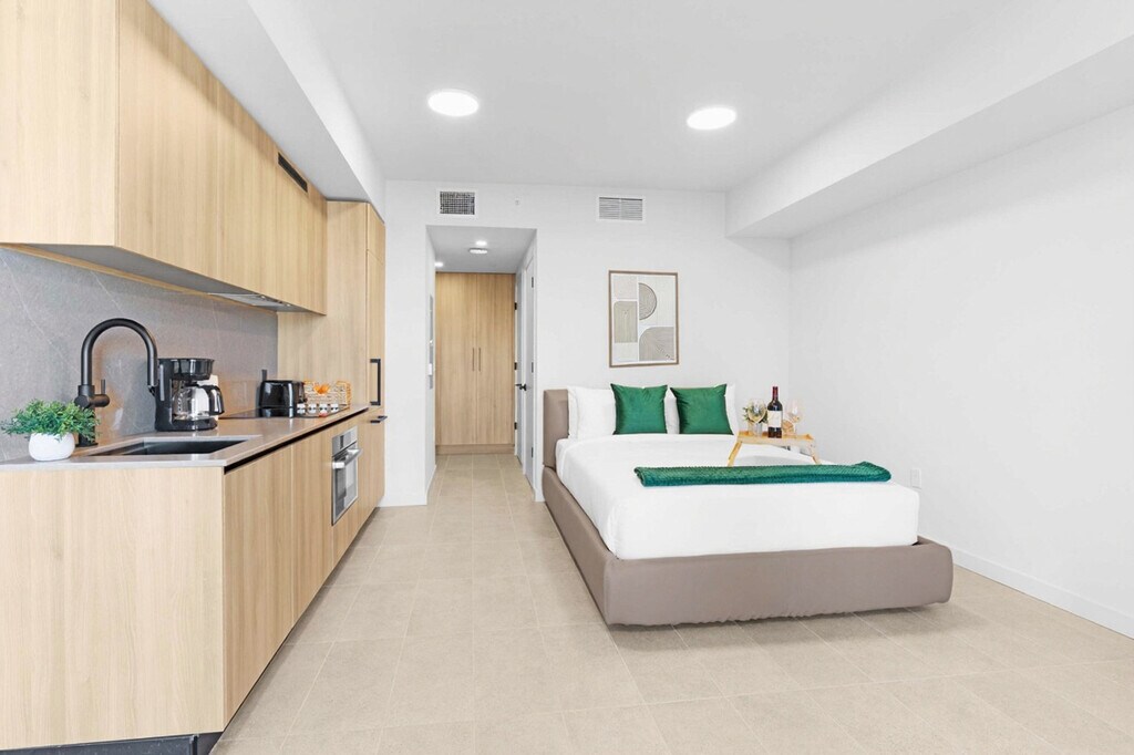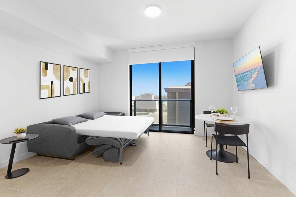 The advertised rate of $3,304/month is the lowest available price, based on a 30 day(s) stay with a move-in date of August 24, 2026. Rates vary depending on the duration of stay, season, and other parameters. For exact pricing and additional pricing components, please visit our website and enter your desired move-in and move-out dates. The rate is applicable when billed upfront; it can be higher if billed in multiple payments. Experience elevated city living in this designer studio on the first floor at 501 Northeast 1st Avenue, Downtown Miami. Feel at home in this bright, modern retreat with floor-to-ceiling windows and a private balcony. This modern residence blends European elegance with smart, space-saving design. It features a fully equipped Italian kitchen, in-unit washer and dryer, and a sleek bathroom. The open-concept layout maximizes comfort and flow, creating a seamless space to relax, work, and unwind. The kitchen includes custom Italian cabinetry and counters, an integrated paneled refrigerator/freezer, a speed oven, a dishwasher, a coffee maker and kettle, cookware and kitchen essentials, silverware, dishes and wine glasses, a dining table, and matte black Kohler fixtures. The bathroom features a custom Italian vanity and counters, matte black Kohler plumbing fixtures, contemporary cabinetry, and finished flooring. Indulge in the rooftop pool, gym, coworking lounges, valet, and 24/7 access. Valet service is conveniently provided. Self-parking is managed by a third-party company, Metropolis, and requires a separate payment directly with them. Parking rates are $15 for 1 hour, $20 for 2 hours, $30 for 3 hours, $40 for 10 hours, and $50 for 24 hours. All rates are subject to taxes and additional fees. Located at 501 First – 501 NE 1st Ave, Miami, FL, you’re in the heart of Downtown Miami, where culture, nightlife, dining, and waterfront views are all just minutes away. This centrally located apartment makes it easy to explore the city. Attractions and highlights include Bayside Marketplace, Kaseya Center, Bayfront Park, Brickell City Centre, Wynwood Arts District, Miami Design District, South Beach and Miami International Airport. Parking enforcement is active 24/7. Please do not place cardboard in the trash chute. Flatten boxes and take them to the loading dock. To prepare for check-in and building registration, provide your full legal name, phone number, email address, and confirmed check-in and check-out dates and times before your arrival. This information must be submitted prior to check-in so the necessary registration can be completed and ensure a smooth arrival. [SI]