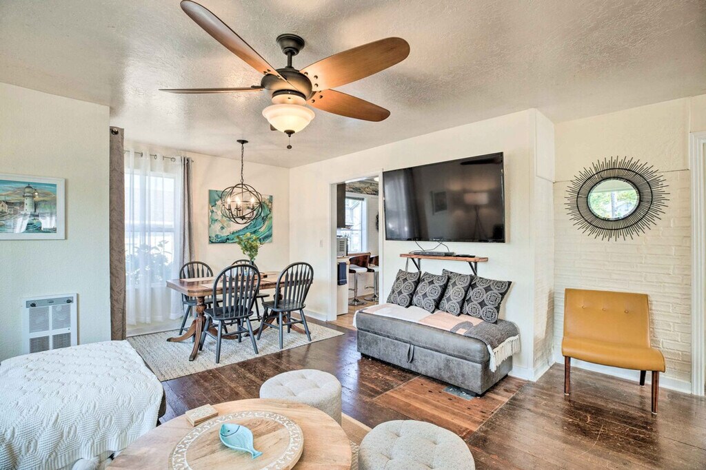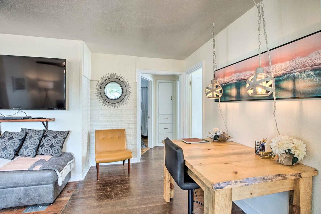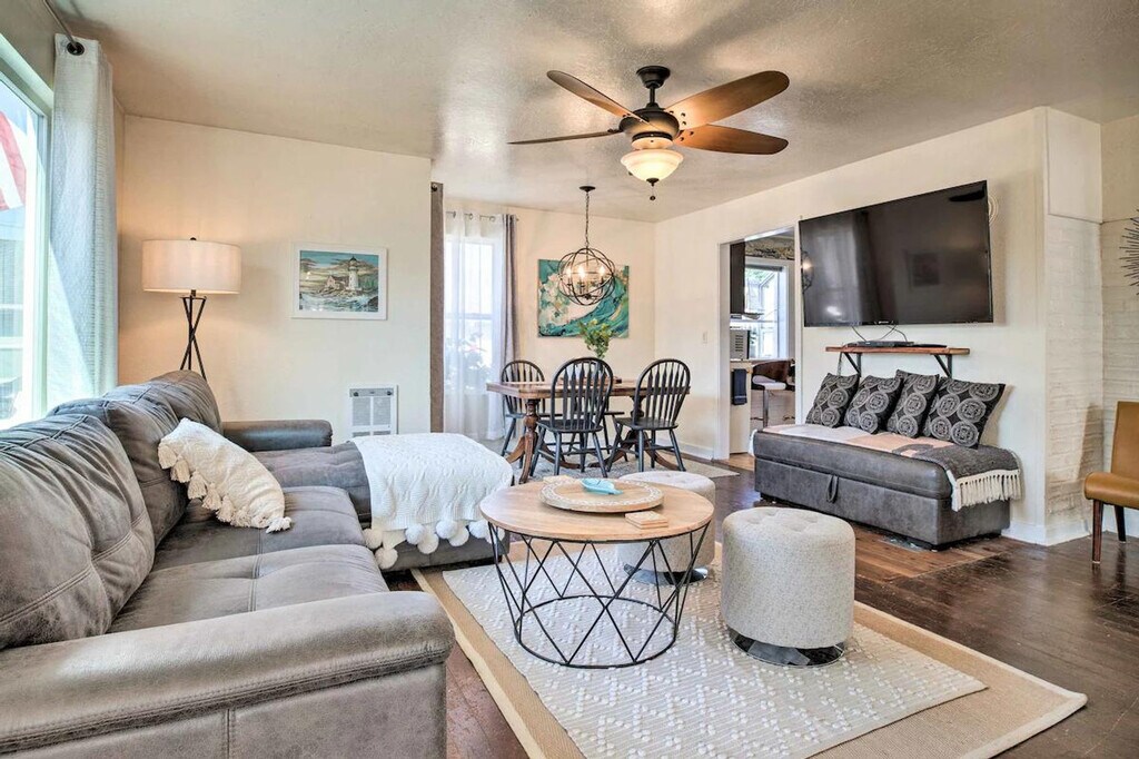 Feel at home in this centrally located 2-bedroom house in Seaview, just steps from the beach. This breezy single-story house offers 850 square feet of living space. This house features inviting furnishings, 3 Smart TVs, a DVD player, a sitting room, an electric fireplace, a dining table, and a well-stocked kitchen with a dishwasher, refrigerator, oven with 4-burner stovetop, microwave, island, breakfast nook, Keurig and drip coffee maker, blender, tea kettle, Crockpot, toaster, cooking basics, dishware, and flatware. Other amenities include free Wi-Fi, electric heating, ceiling fans, linens/towels, complimentary toiletries, a hair dryer, hangers, trash bags, and paper towels. This property is dog-friendly with a $25 fee per pet. Venture up to the Long Beach Boardwalk, spend the day on the ‘World’s Longest Beach,’ or explore Cape Disappointment State Park. Enjoy access to a nearby bike path. The property has ceiling fans but does not offer air conditioning. No smoking, events, parties, or large gatherings are allowed. Includes a work-from-home desk. [SI]