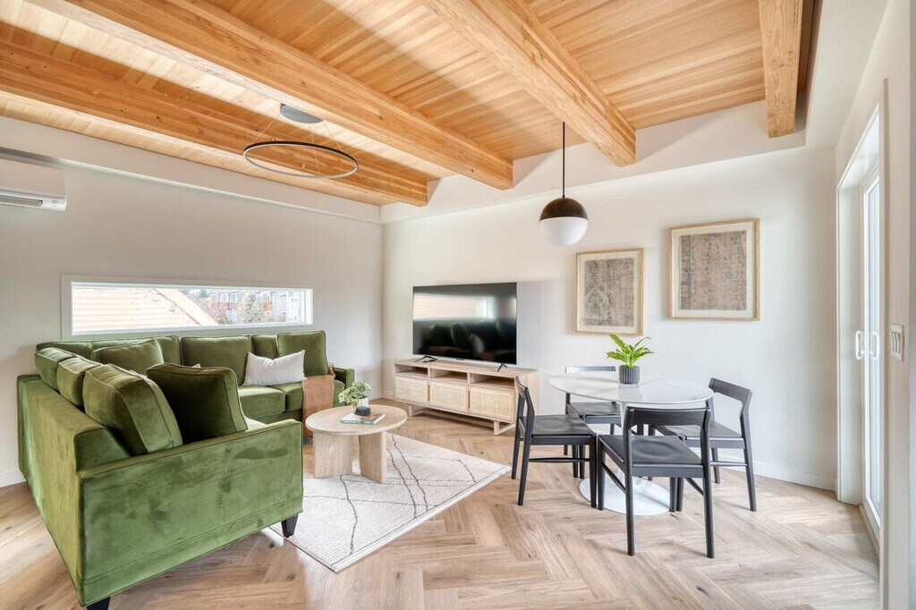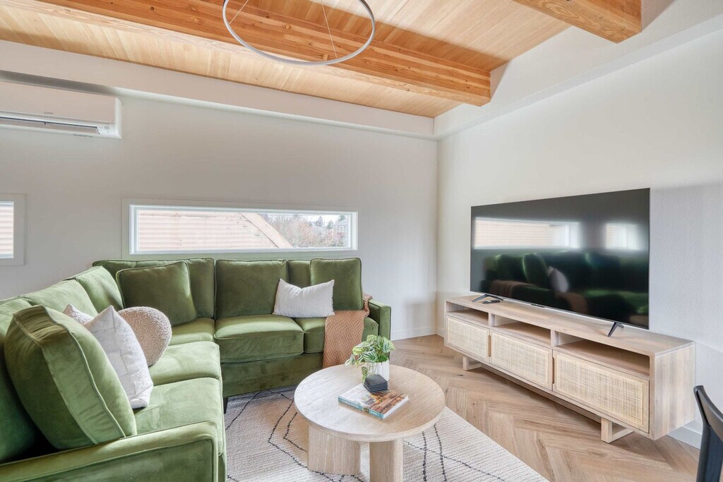 Feel at home in this stylish townhome steps from Portland’s Alberta Arts District, featuring vaulted ceilings, herringbone floors, and tons of natural light. This home features a chef’s kitchen, Juliet balconies, and a cozy patio. The sleek open kitchen is stocked with everything from sharp knives to a French press. A Smart TV and fast Wi-Fi are available throughout. The lower level offers two private bedrooms, including a fully separate in-law suite with its own entrance, kitchenette, lounge space, and en-suite bathroom. The second bedroom on this floor is quiet and restful with warm textures and quality linens. Two bright bedrooms open onto Juliet balconies via oversized sliding glass doors. Soft linens, room-darkening curtains, and ample storage make these rooms both functional and serene. A modern shared bathroom and in-unit laundry room round out this top floor. A fee of $99 per dog applies, with a maximum of 2 dogs allowed. Located in one of Portland’s most vibrant and walkable neighborhoods, Alberta Arts is bursting with color, culture, and creativity. Murals line the streets, and nearly every block is home to an art gallery, boutique, coffee shop, or food destination. Walk to Salt & Straw for inventive ice cream flavors, grab brunch at Tin Shed Garden Cafe, or enjoy local beers at Great Notion. Alberta Park is just a few blocks away for green space and a relaxing stroll. You're just 15 minutes from downtown and 20 from the airport. Please be respectful of quiet hours after 10 p.m. Smoking tobacco or marijuana inside is strictly prohibited and if detected, will result in $150 penalty. Events and/or parties are strictly prohibited and will result in fines per host discretion and immediate eviction. Any unauthorized guest is subject to a $150 per guest penalty. Unauthorized use of extra bed/s or bedroom/s a fine of $75. Undeclared pets are subject to a $200 per stay penalty. Any unauthorized early check-in or late check-out is subject to a $75 fee. A missing key that is lost, missing or otherwise unreturned is subject to $100 fee. Missing remotes will incur a $50 fee. Violation of house rules may result in eviction and/or monetary fine. [SI]