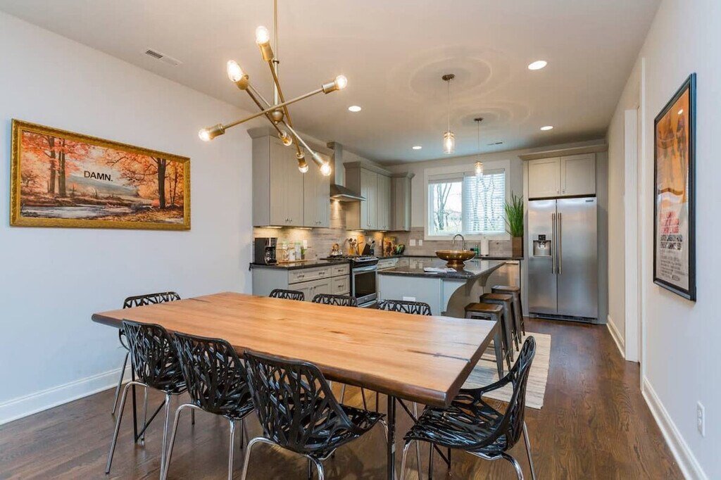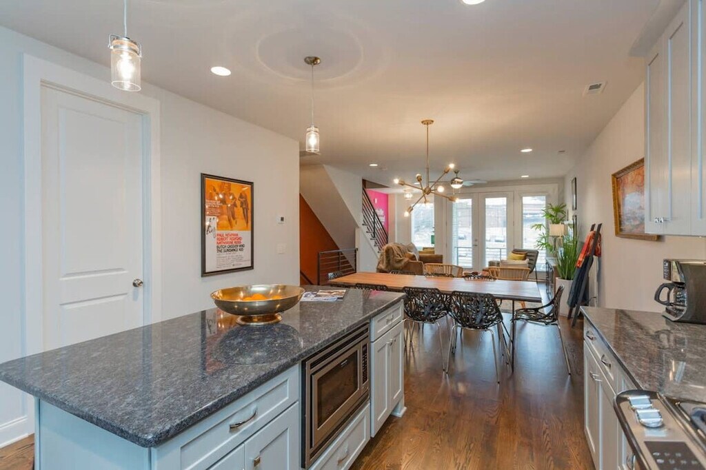 Indulge in this stunning 3-bedroom haven, each with a king bed and private bathroom. Ideally located just 2.5 miles from vibrant Broadway and adjacent to Geodis Park, this home is a perfect sanctuary between adventures. Rich colors and textures blend with bold featured walls and cultural accents, capturing the essence of Nashville. The living room features a full/queen sleeper sofa and two cozy pull-out chairs, ideal for children. Experience the best of Music City in style and comfort. Step into this beautiful, spacious, and brand new 3-bedroom, 2-bath home in Nashville’s trendy Wedgewood-Houston neighborhood. With a careful eye on design, a vibrant mix of rich colors and textures brings the space alive. Built in 2018, this 1,915 square foot contemporary home offers a perfect getaway. Thoughtfully decorated and set up with all the amenities you would find in a hotel, this home provides a beautiful place to start your day and a comfortable retreat at the end of the day. The entrance level has no steps from the garage (3 steps in front) and includes a king bedroom with an en-suite full bathroom. The second level hosts the living room and kitchen, while the third level features two king en-suite bedrooms. The living room offers two hotel-style rollaway beds with a half bath. Although breakfast is not served, complimentary coffee, tea, and light snacks are available. Dogs are welcome with specific rules: only dogs under 50lbs are allowed, and they must be leashed when outside, crated if left alone, and housebroken. Guests must pick up after their dogs and ensure they do not cause excessive noise. The driveway can park two cars. Wedgewood-Houston is a rapidly developing neighborhood with new businesses popping up all around. Downtown is only 10 minutes away, making it easy to enjoy the city's top dining, boutique shops, and lively entertainment. Uber and Lyft are great options for getting around Nashville, with rides typically costing $10 or less. If you decide to rent a car, the driveway can accommodate two cars. The property is conveniently located near several attractions, including BNA Airport (8.3 miles), Music City Center (2.8 miles), Downtown Broadway/Bridgestone Arena/The Ryman (2.8 miles), and Nissan Stadium (3 miles). This property enforces a strict no-party policy. Unapproved visitors, events, or parties may result in early checkout and additional fees of $500 or more. Smoking is not allowed inside, on balconies, patios, rooftops, or within 25 feet of the property. A $500 fee will apply if smoke of any kind is detected in the home. Early check-ins or late check-outs must be pre-arranged. Non pre-arranged late check-outs will result in additional fees. Exterior cameras are used for safety and property protection. Please ensure all doors are shut and locked when not in use, and do not leave valuables in vehicles parked on the street. Registration Number: [SI]